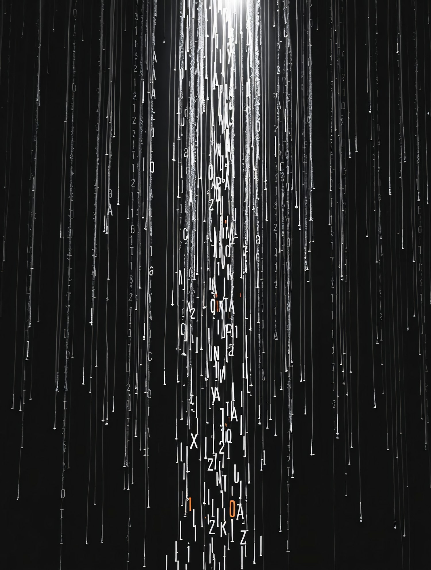 Abstract streams of alphanumeric characters cascade against a dark background, creating a dynamic and futuristic digital aesthetic.