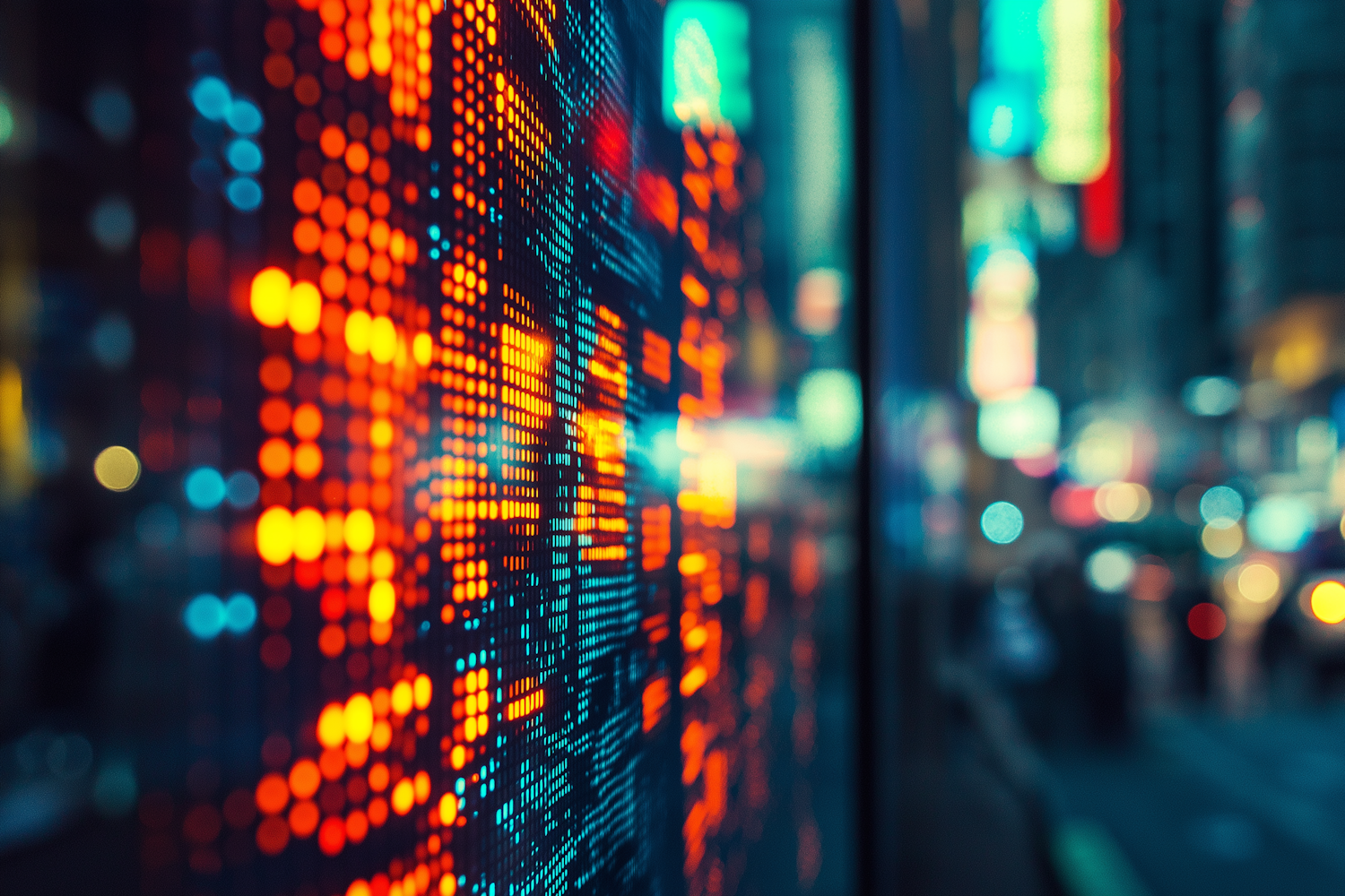 Close-up of a glowing digital display with orange and blue lights, set against a blurred cityscape with vibrant bokeh effects.