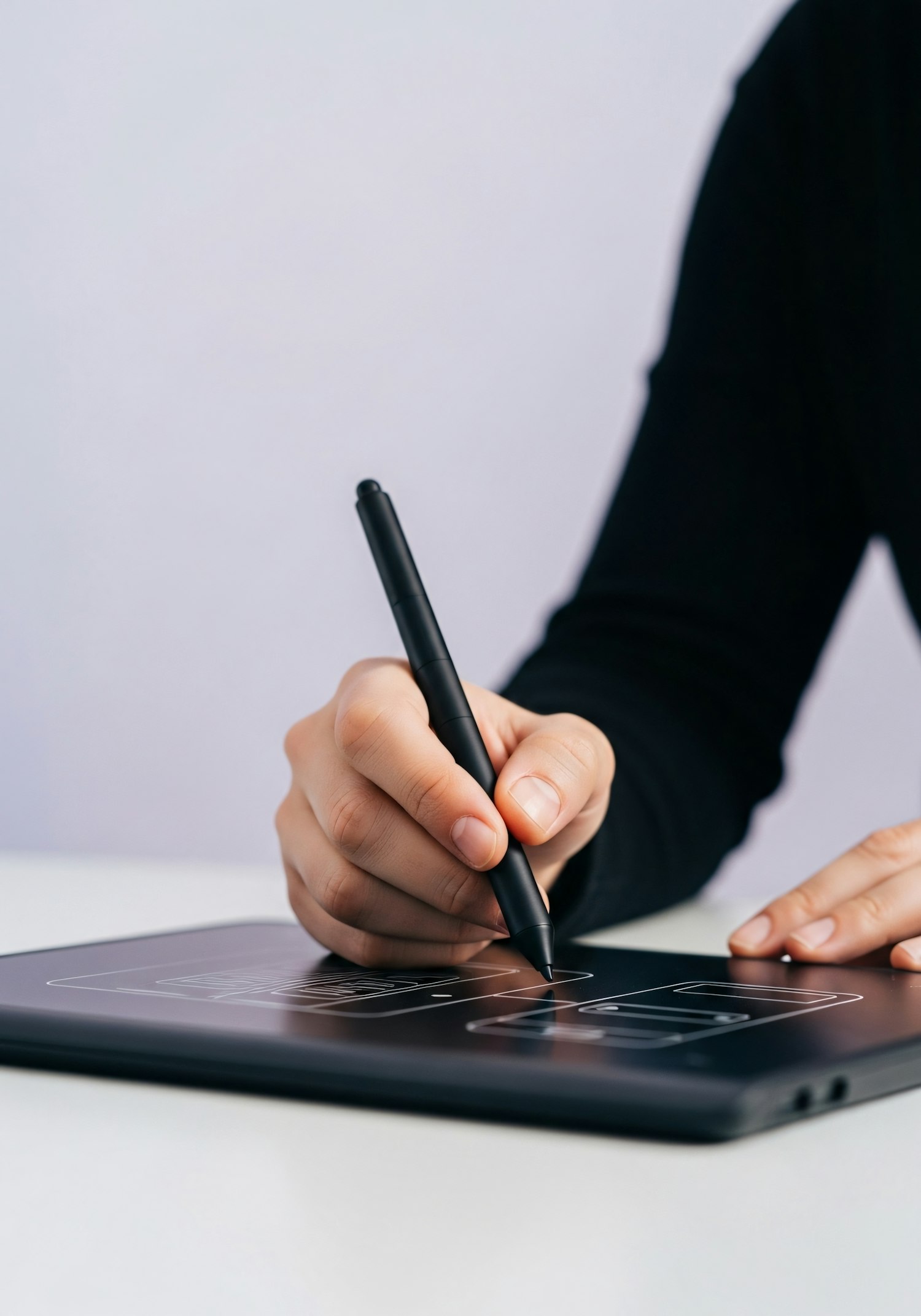 Close-up of a hand using a stylus on a digital tablet, creating designs on a sleek interface. Perfect for tech and creativity themes.