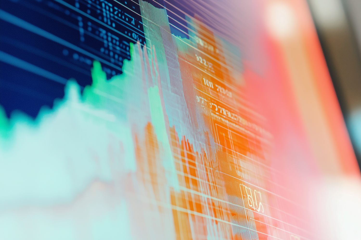 Vibrant financial chart with green, orange, and blue trends on a digital screen, showcasing market data and analytics in a modern style.