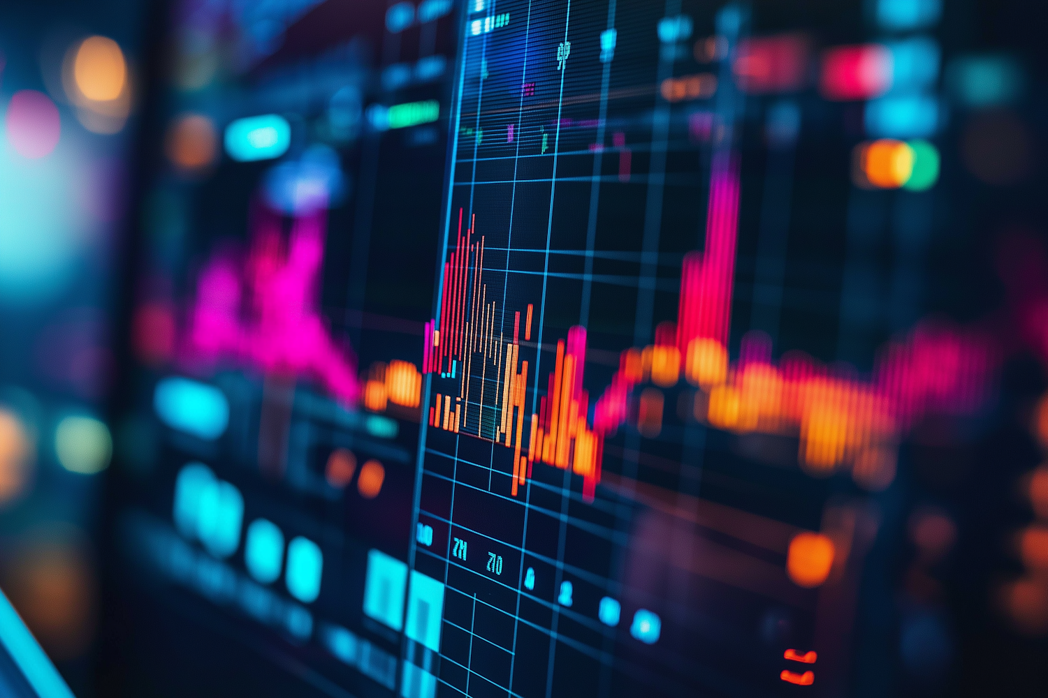 Close-up of a colorful financial chart with candlestick patterns, grid lines, and bokeh lights, symbolizing market trends and data analysis.