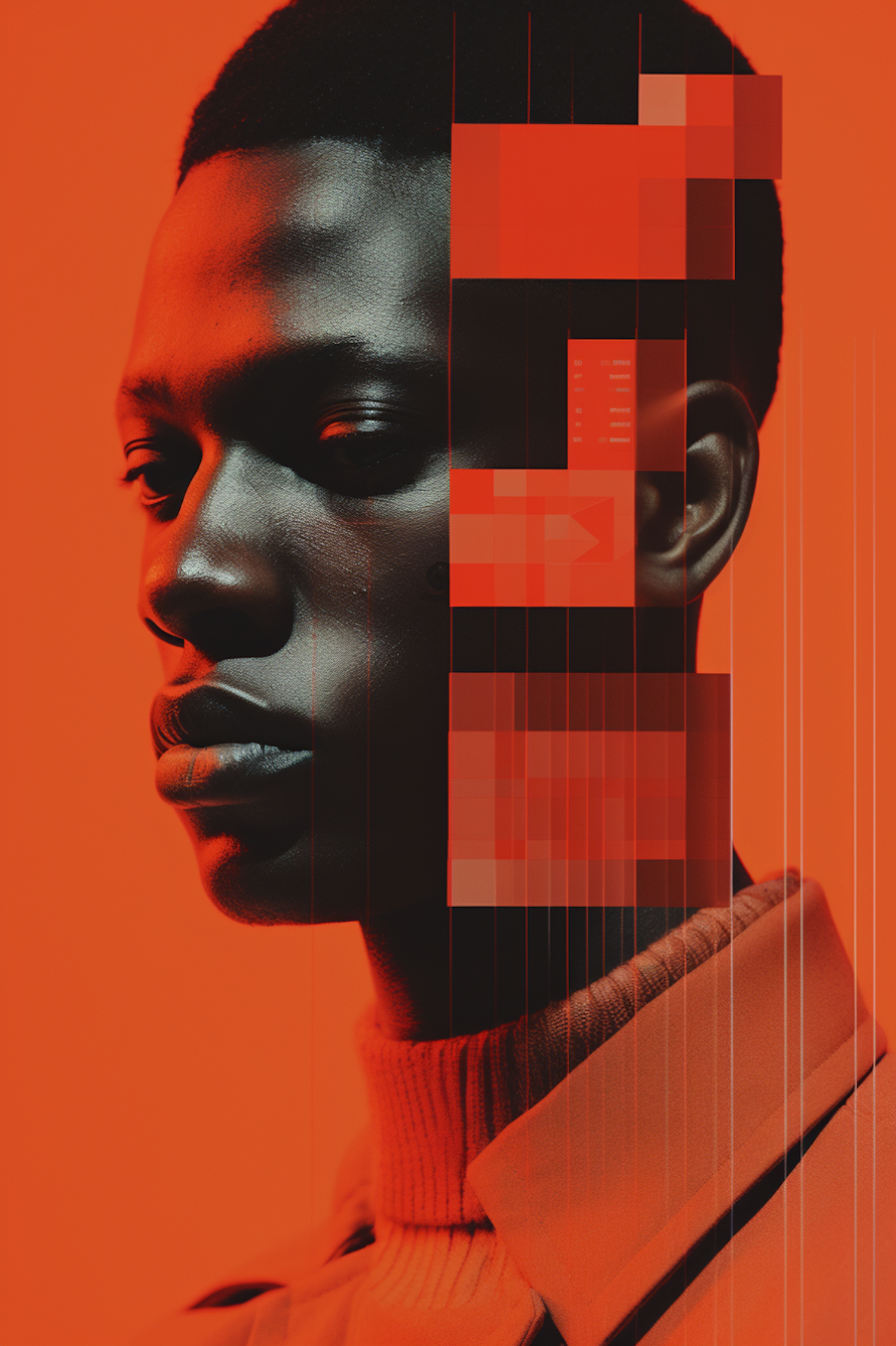 A futuristic portrait of a man with digital overlays and a vibrant orange theme, blending human and technological elements.