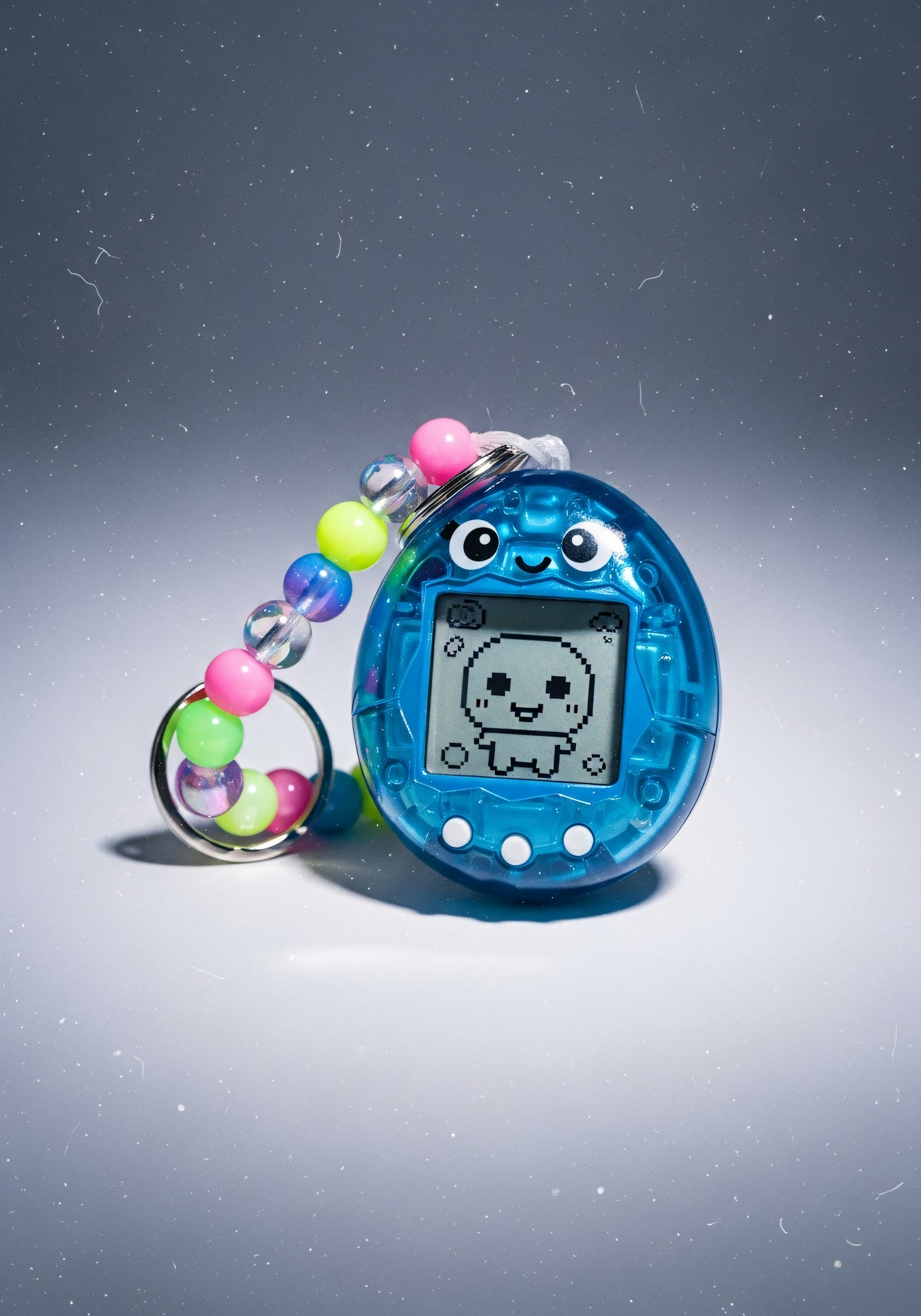 A vibrant blue digital pet device with a colorful beaded keychain, showcasing a pixelated character on its screen against a soft gray background.