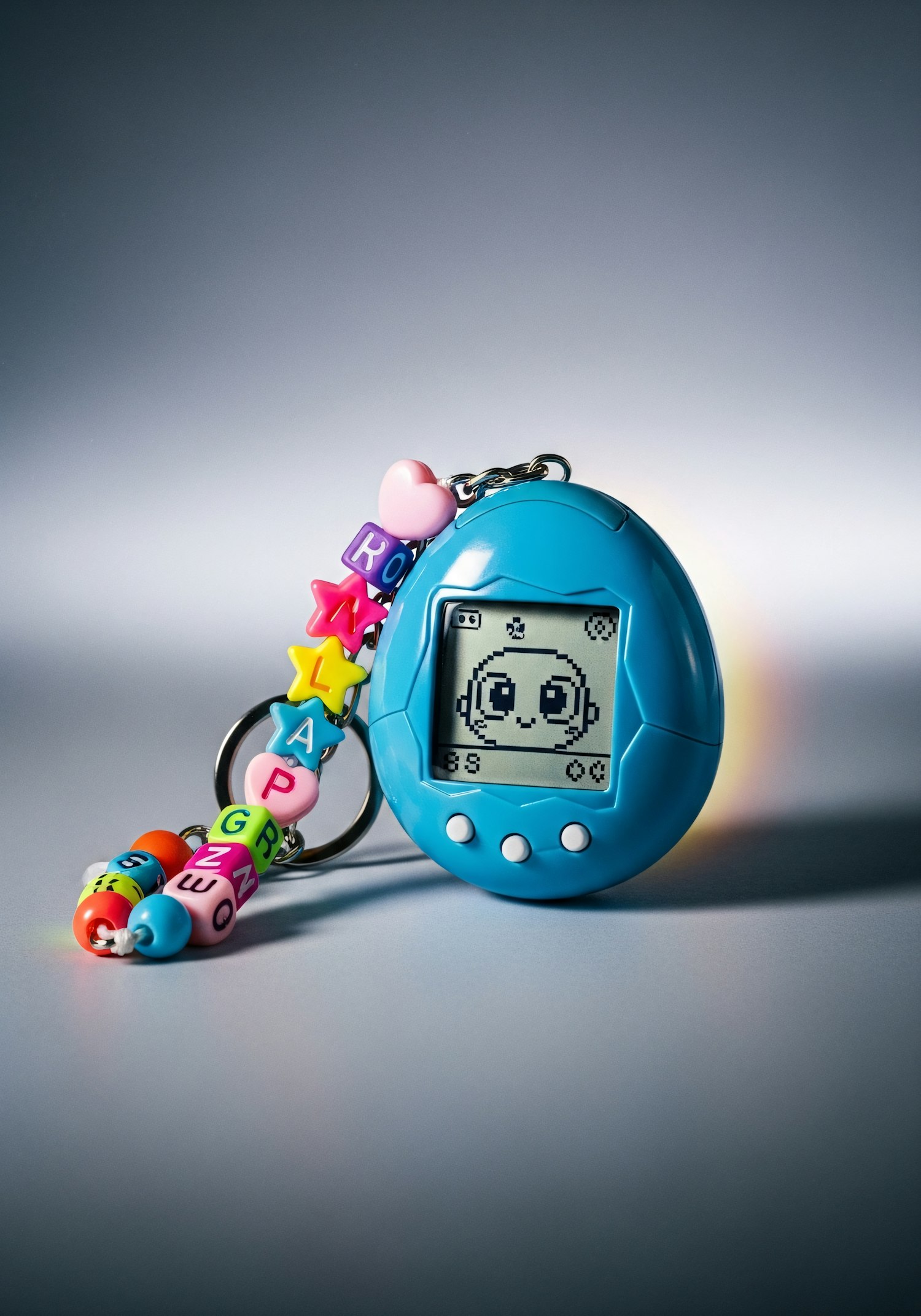 A blue digital pet device with a colorful beaded keychain, showcasing a pixelated character on its screen, set against a soft gradient background.