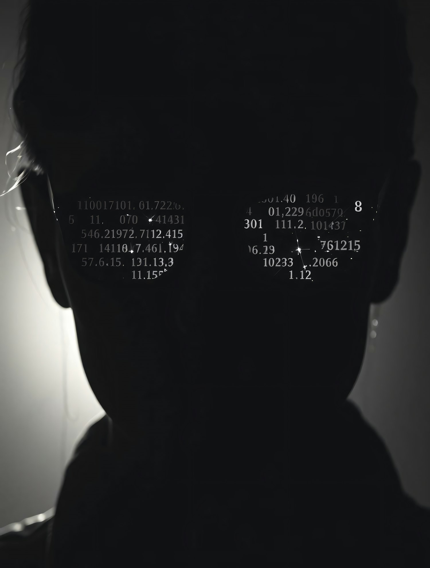 A silhouette of a person with glasses reflecting numerical data, evoking themes of technology and mystery.