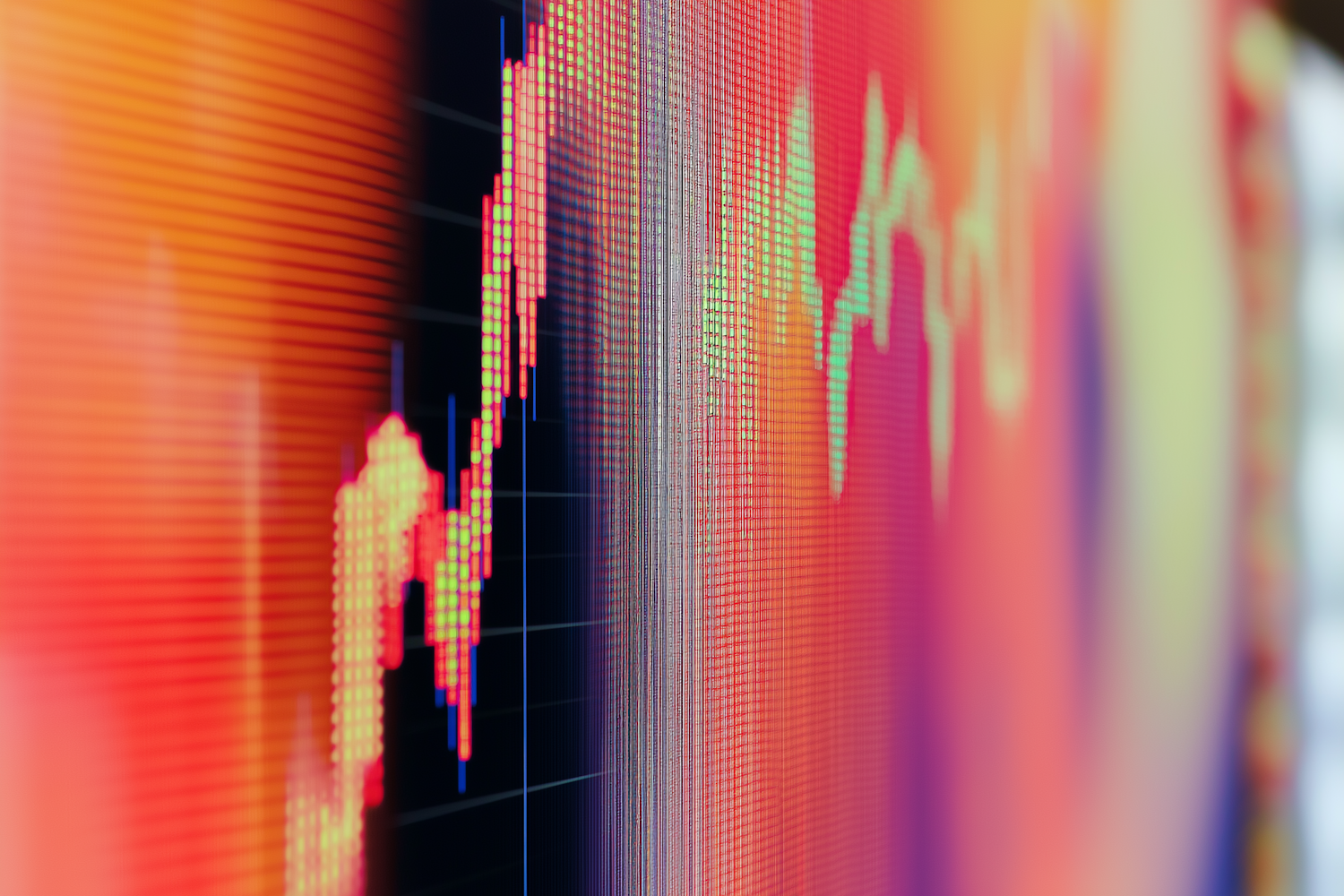 Vivid close-up of a stock market chart with fluctuating lines in red, orange, and green tones, symbolizing market trends.