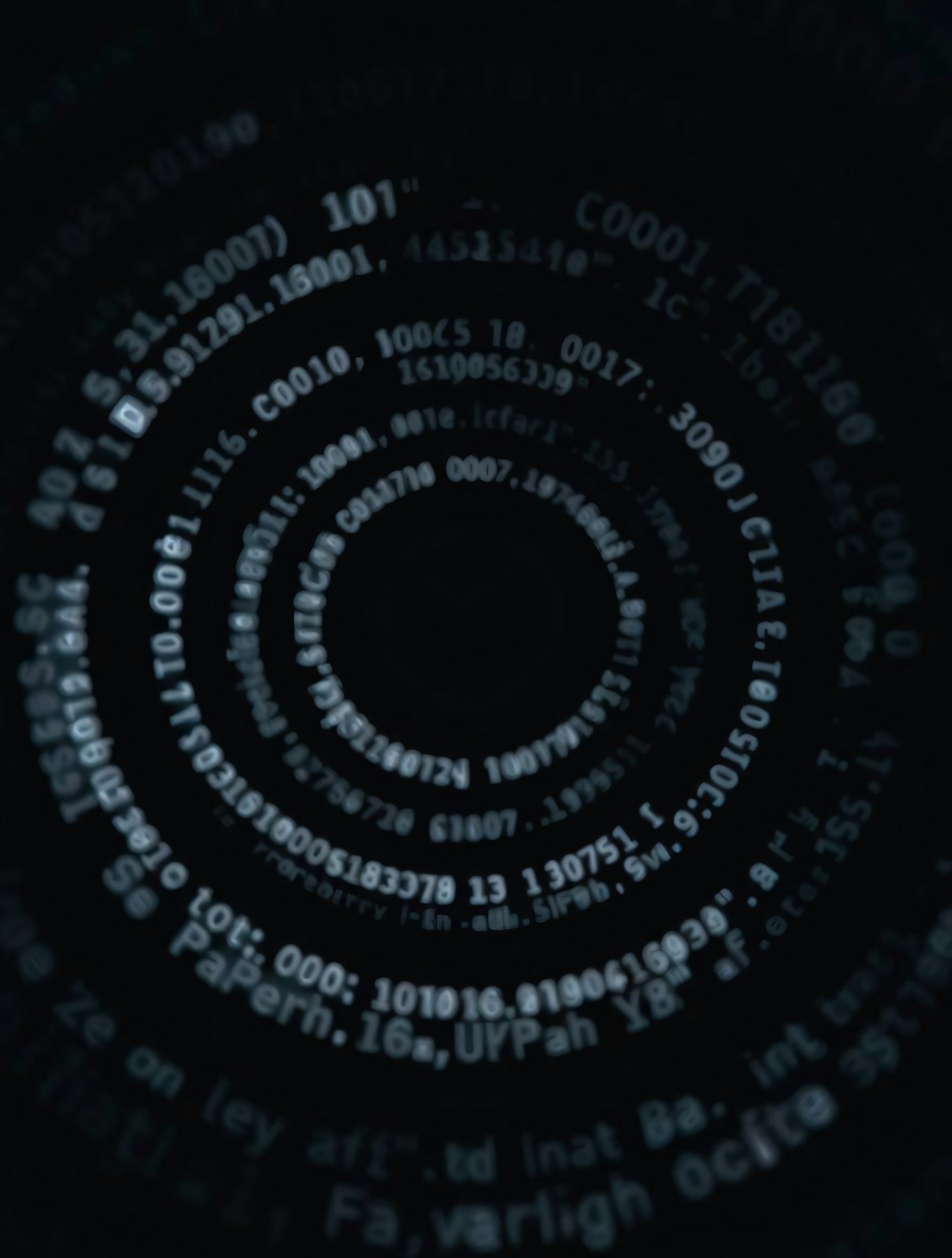 A dark, futuristic design with concentric circles of alphanumeric text, creating a tunnel-like effect with a cybernetic aesthetic.