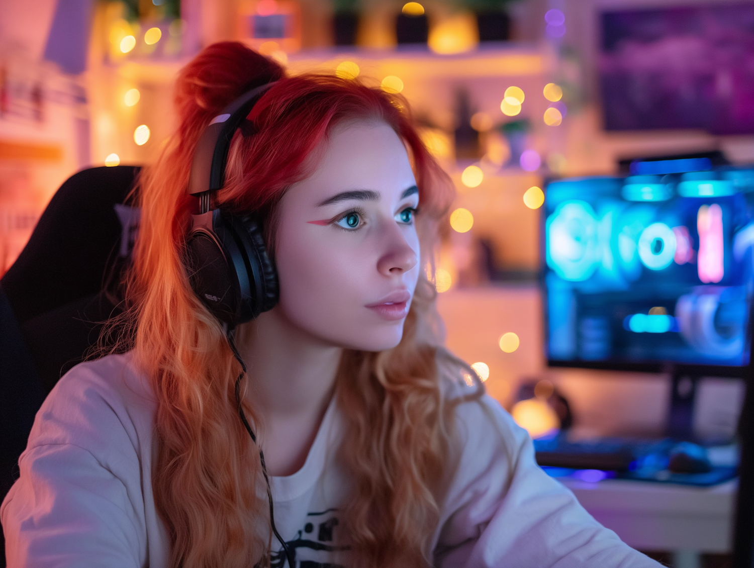Young woman gaming with headphones, surrounded by cozy lights and a glowing computer screen, creating an immersive atmosphere.