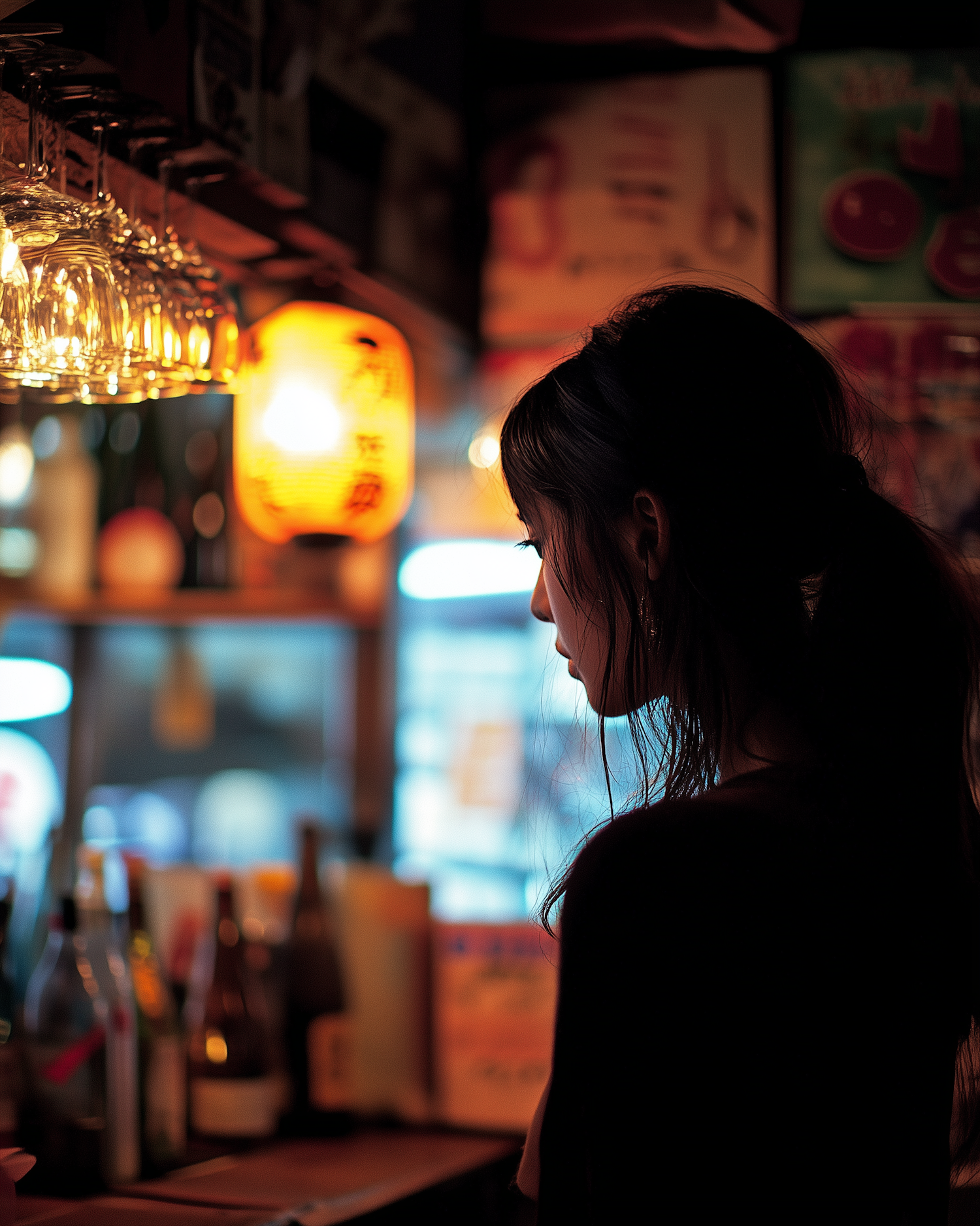 A contemplative woman in a dimly lit bar, illuminated by a warm lantern glow, surrounded by hanging glasses and blurred bottles.