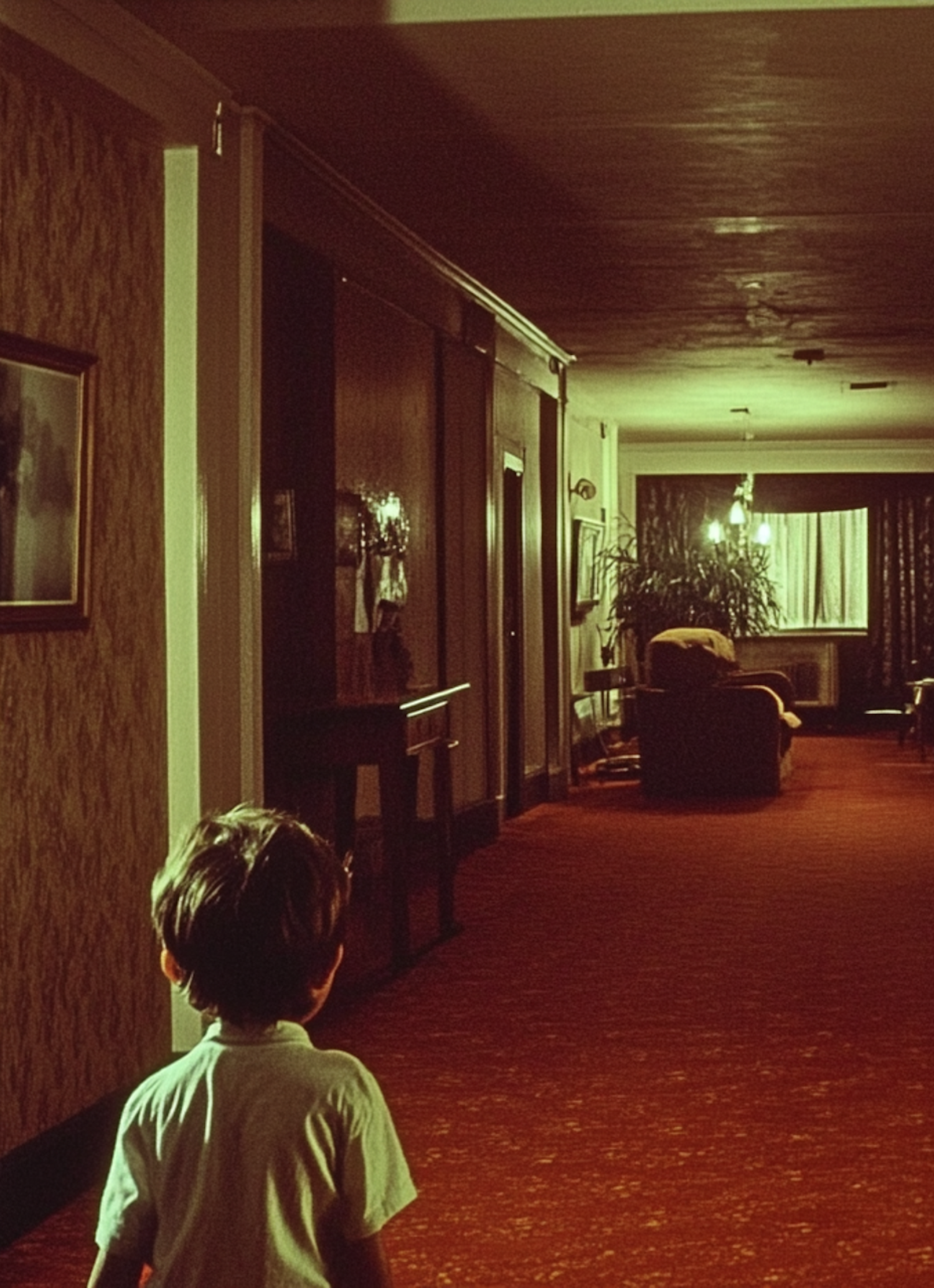 A child stands in a dimly lit hallway with red carpet and patterned wallpaper, creating a warm yet eerie atmosphere.
