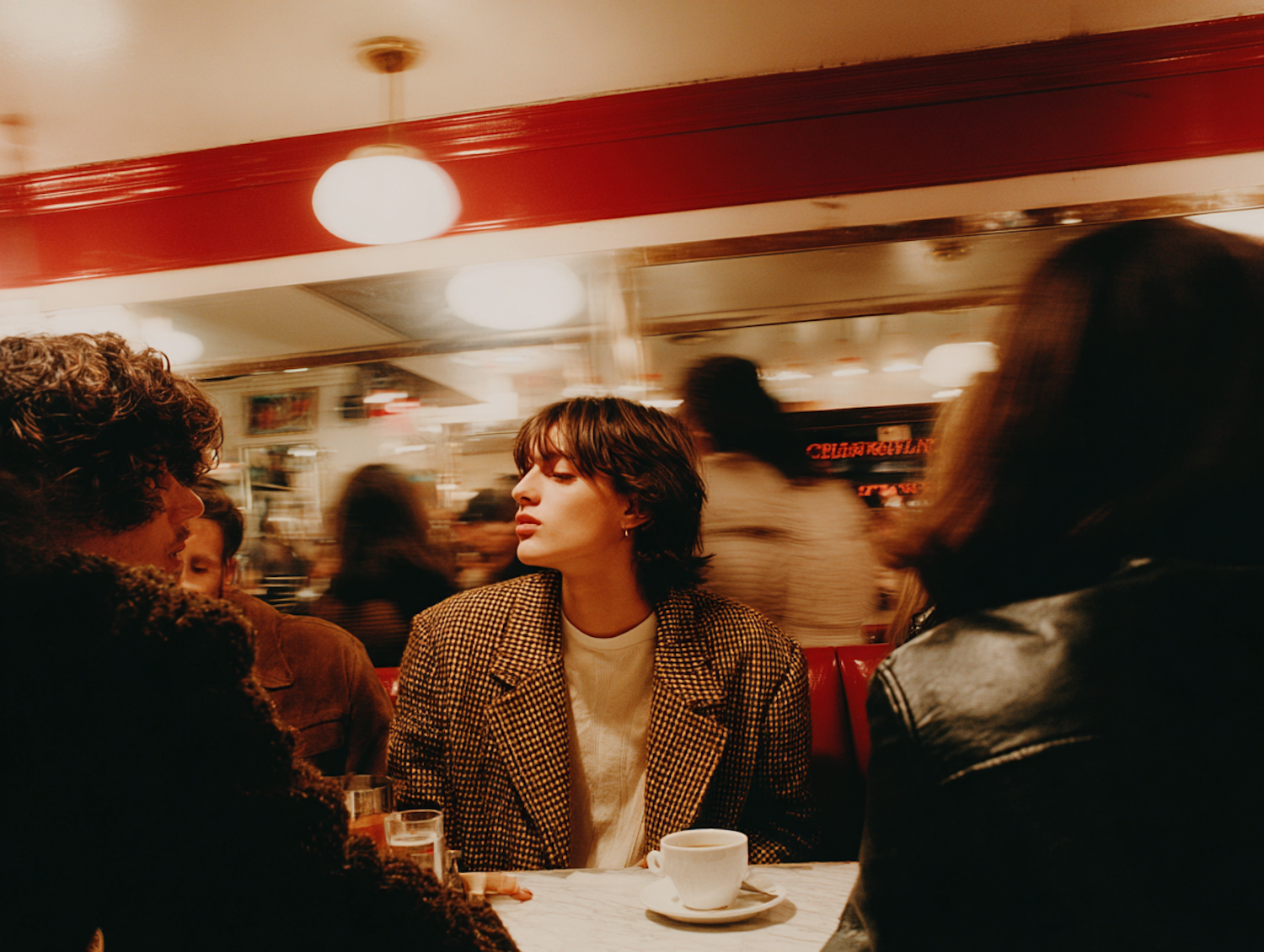 A cozy diner scene with friends gathered around a table, warm lighting, and a reflective mirror capturing the lively ambiance.
