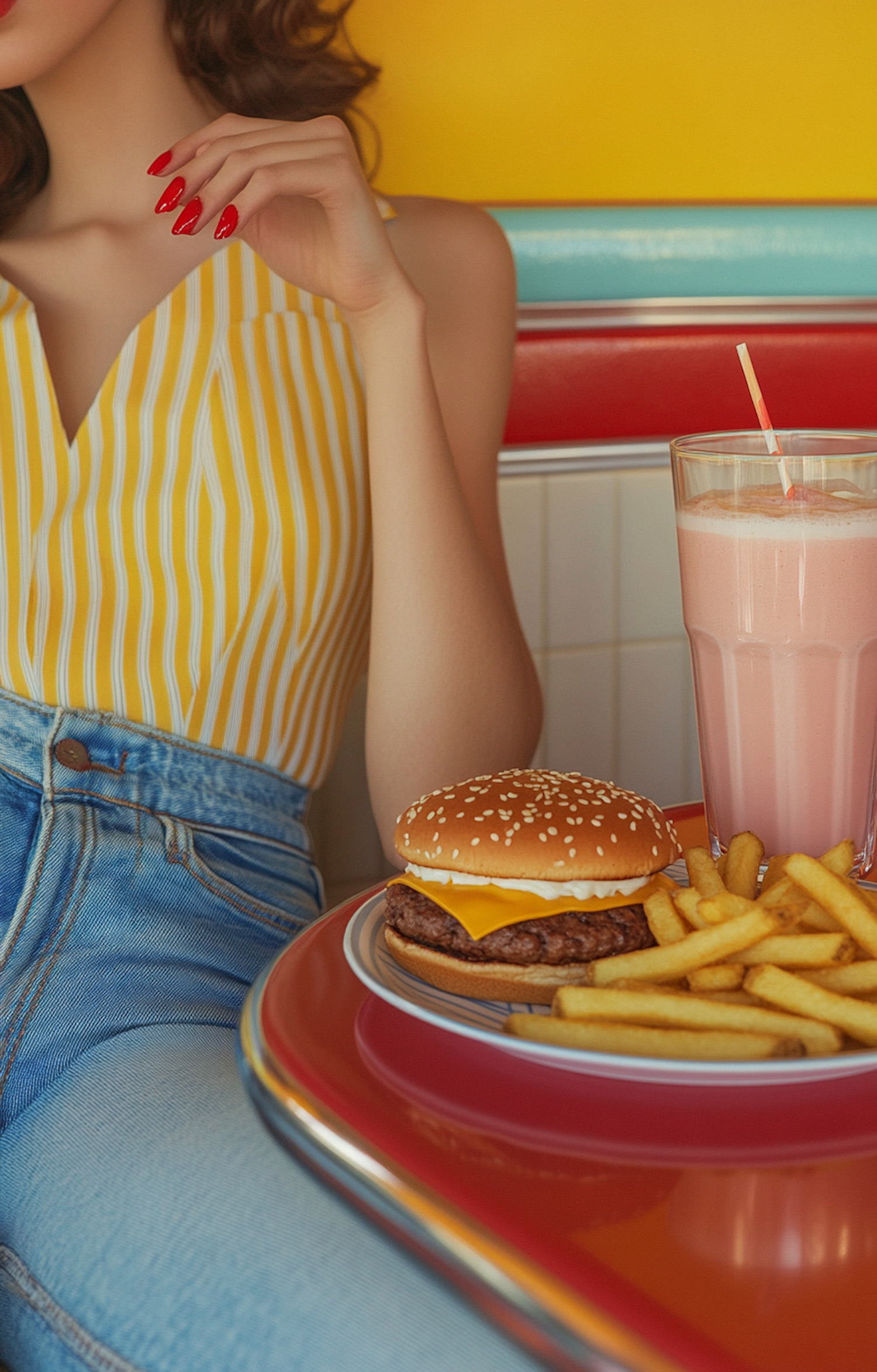 Retro diner scene with a cheeseburger, fries, and milkshake. Woman in yellow striped top and red nails adds vintage charm.