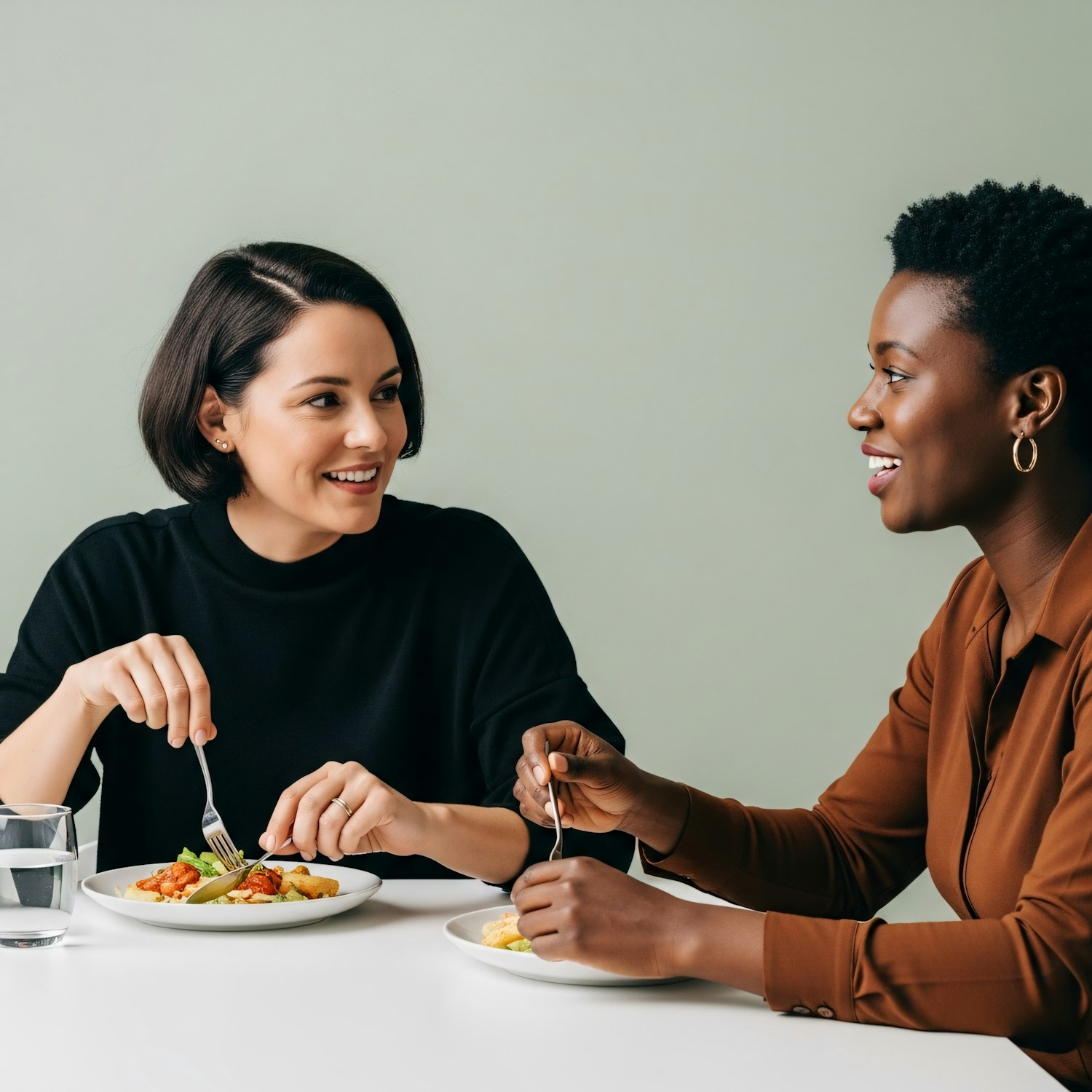 Two women sharing a meal and enjoying a conversation, creating a warm and friendly atmosphere.