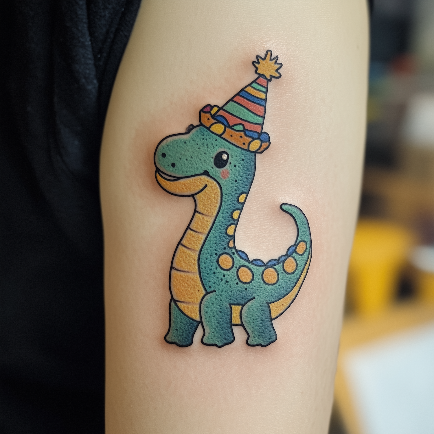 Adorable cartoon dinosaur tattoo with a party hat on a light beige arm, featuring vibrant colors and a playful design.