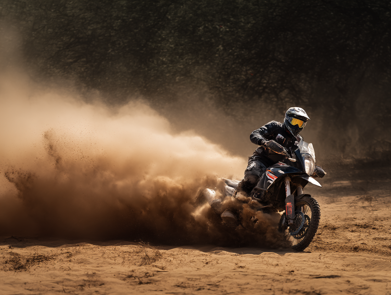 Motorcyclist skids through sandy terrain, kicking up a dramatic dust cloud. Full protective gear and dark foliage add to the intense action vibe.