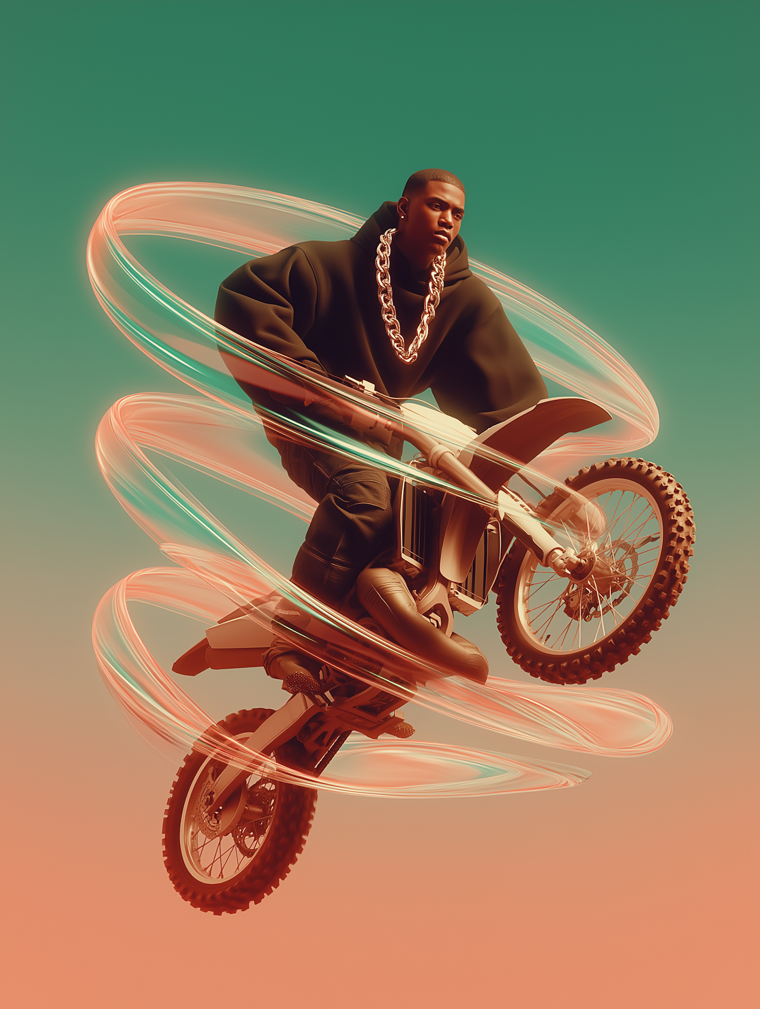 A stylized image of a man on a dirt bike mid-air, surrounded by glowing light trails, set against a gradient background.
