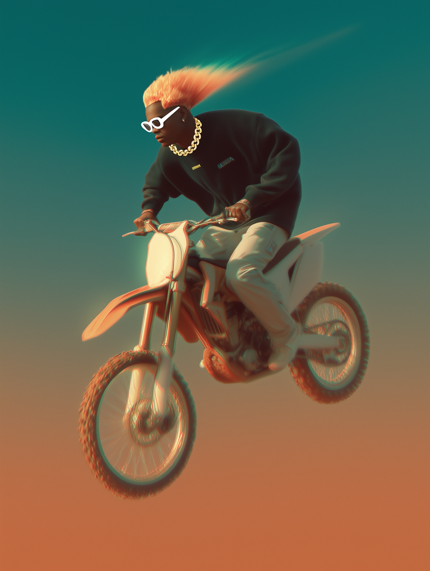 A person with orange hair and sunglasses performs a jump on a dirt bike against a vibrant gradient background.