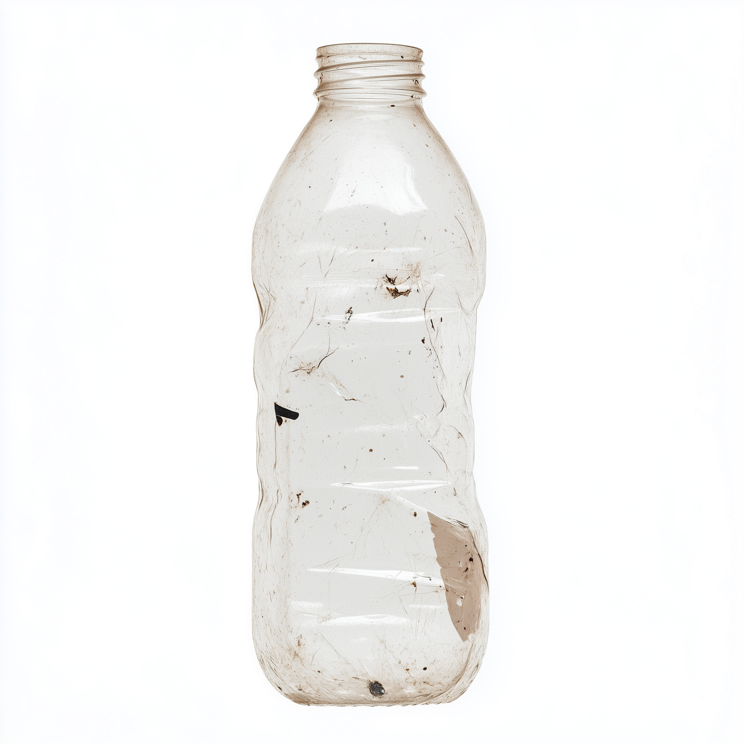 A dirty, crumpled plastic bottle with visible scratches and debris, set against a plain white background.