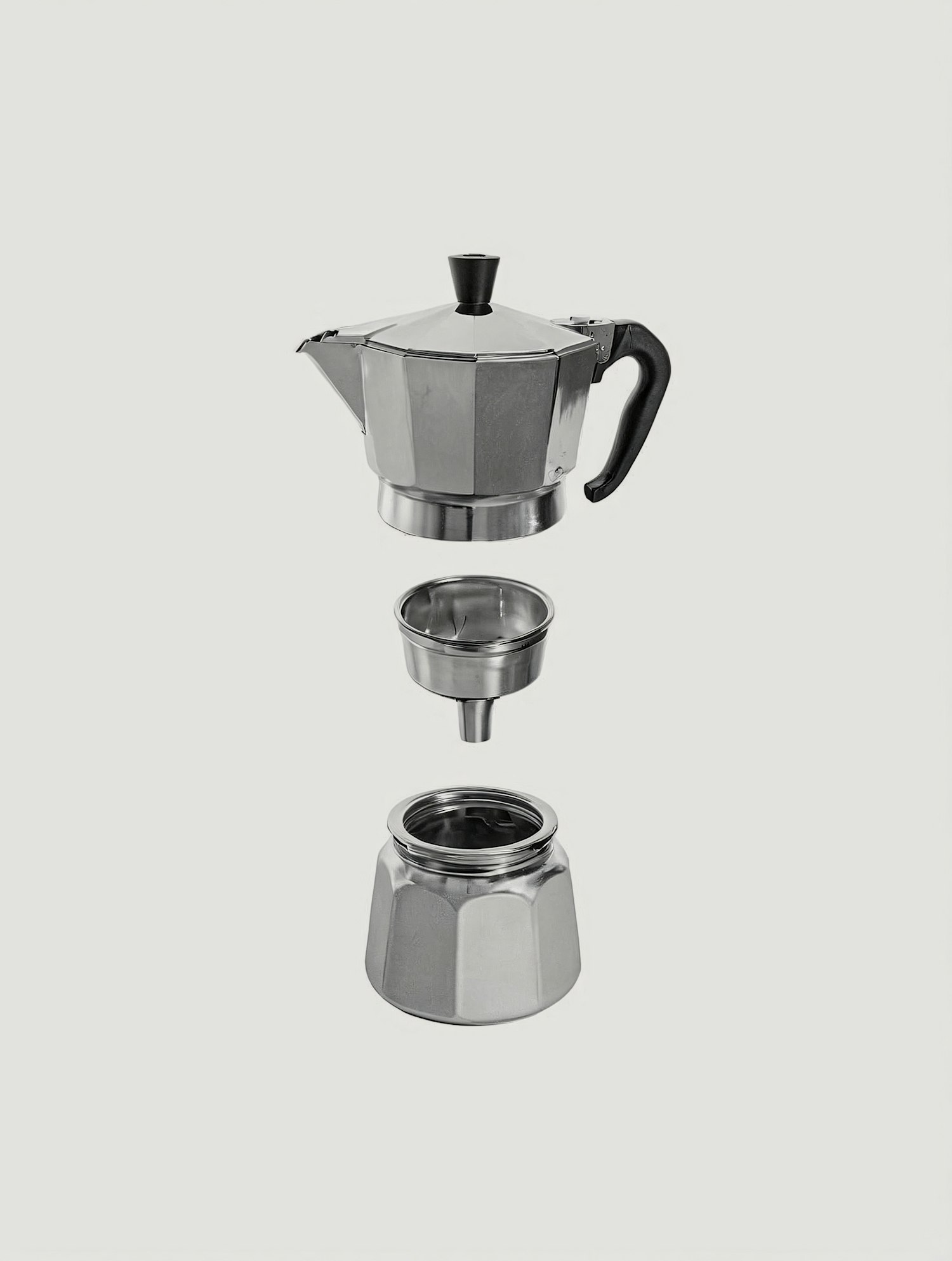 Disassembled stovetop espresso maker with polished steel parts and black handle, displayed against a plain light background.