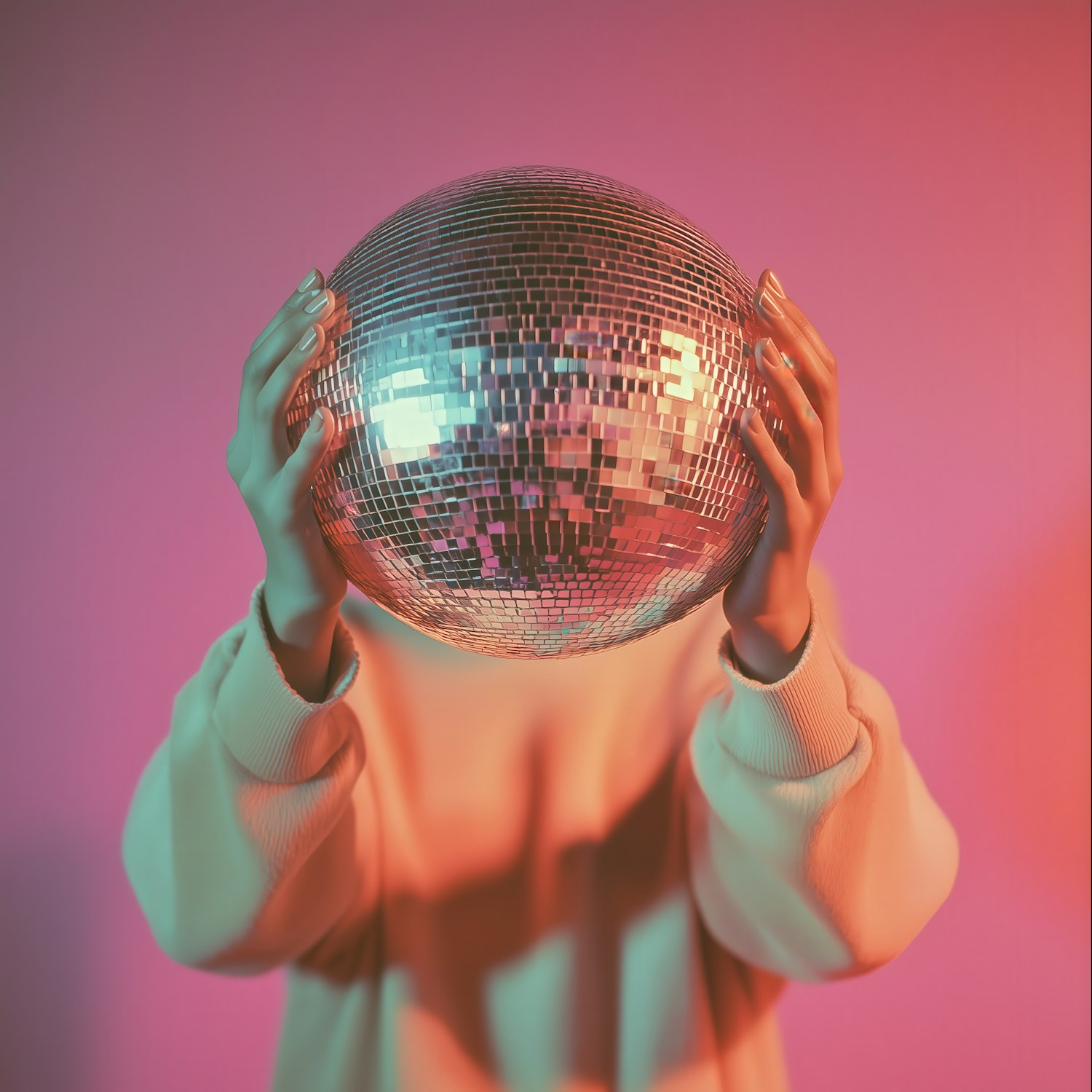 A person holds a reflective disco ball in front of their face against a pink-orange gradient background, creating a retro, artistic vibe.