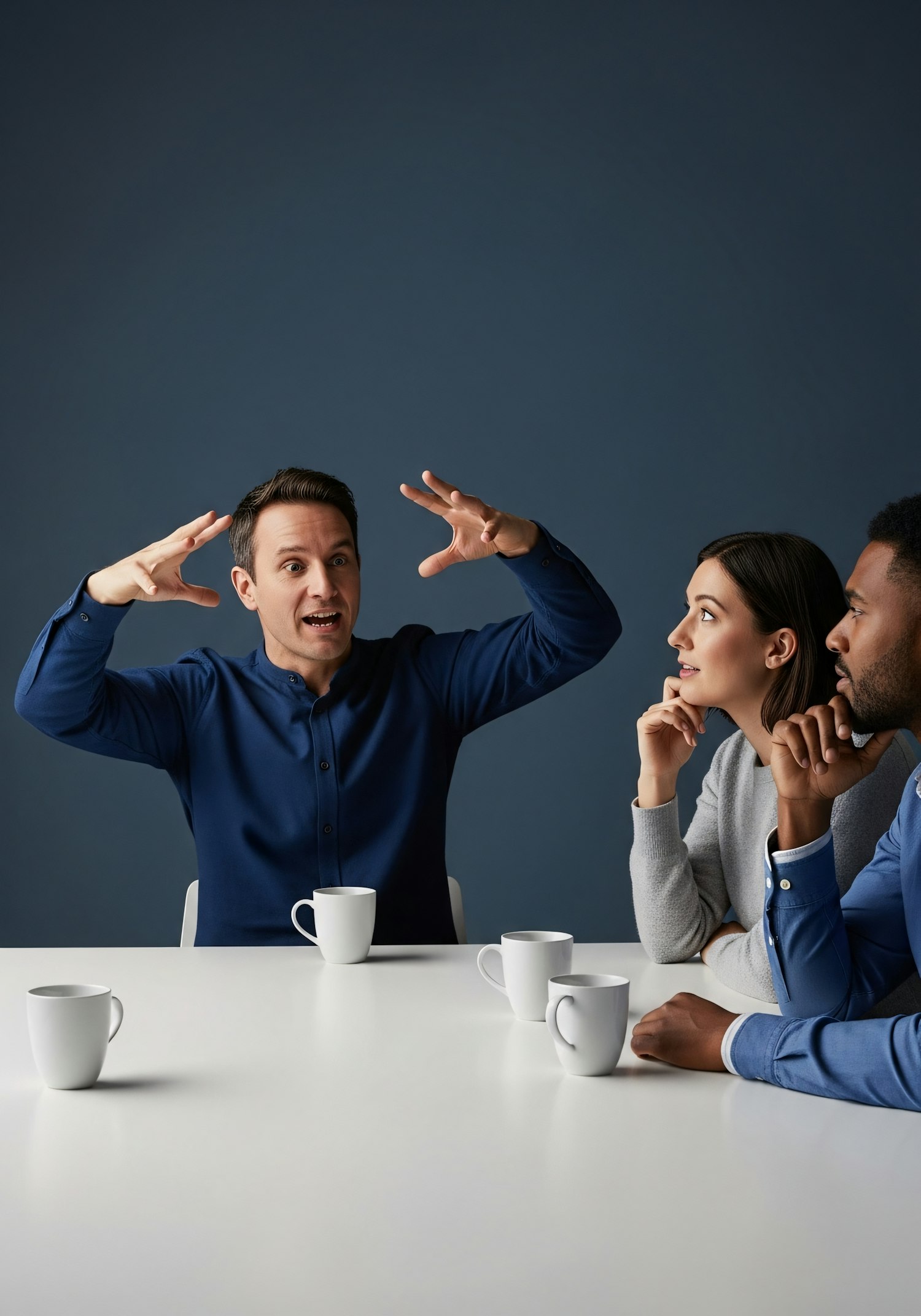 Three people engaged in a lively discussion at a table with coffee mugs, set against a dark blue background.