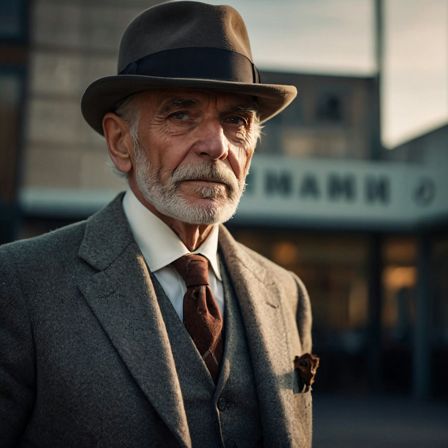 Elderly man in a gray suit and fedora, exuding timeless elegance with a serious expression in an urban setting.