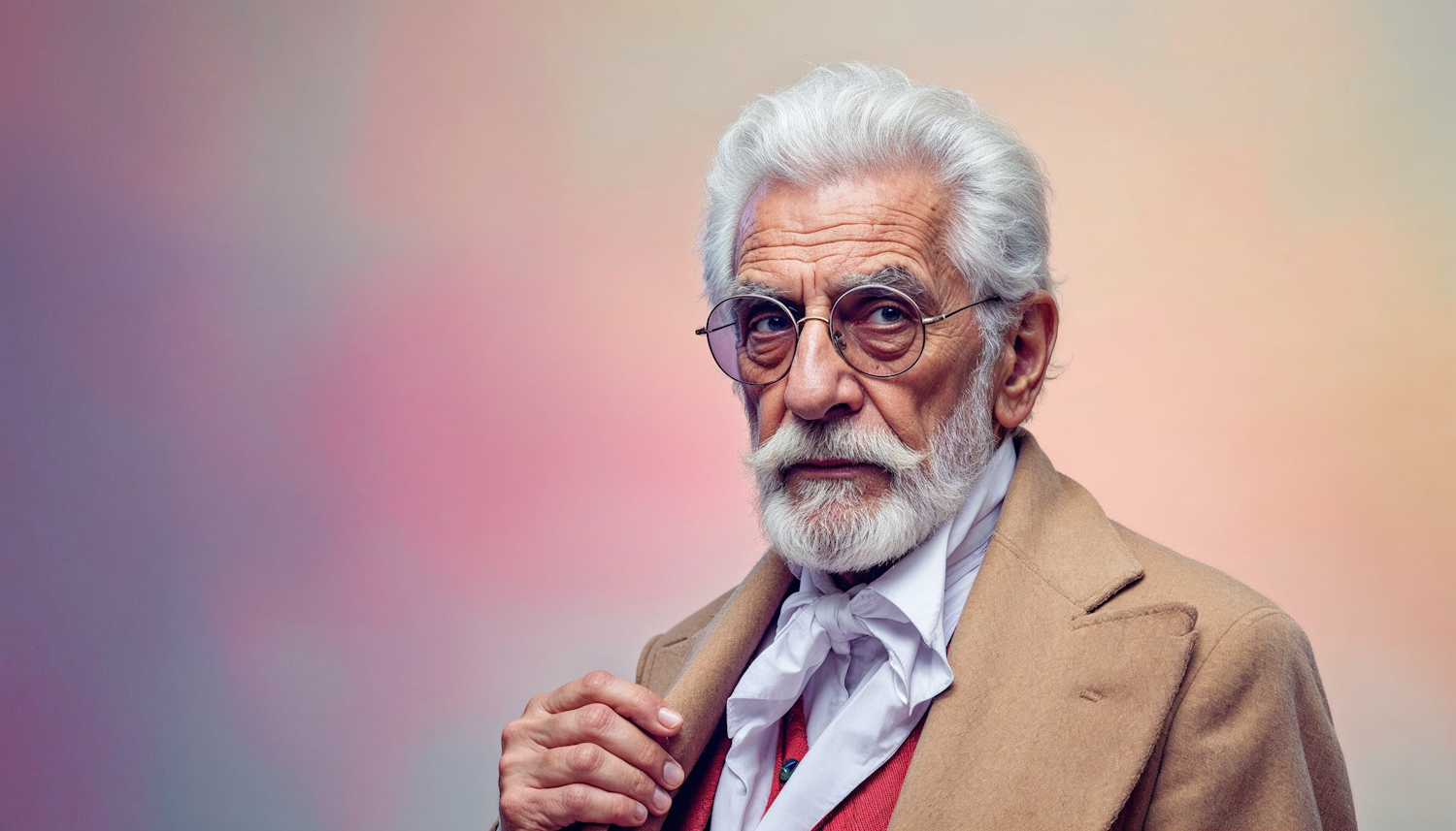 Elderly man with white hair and beard, wearing glasses and a tan coat, against a pastel background. Elegant and distinguished look.