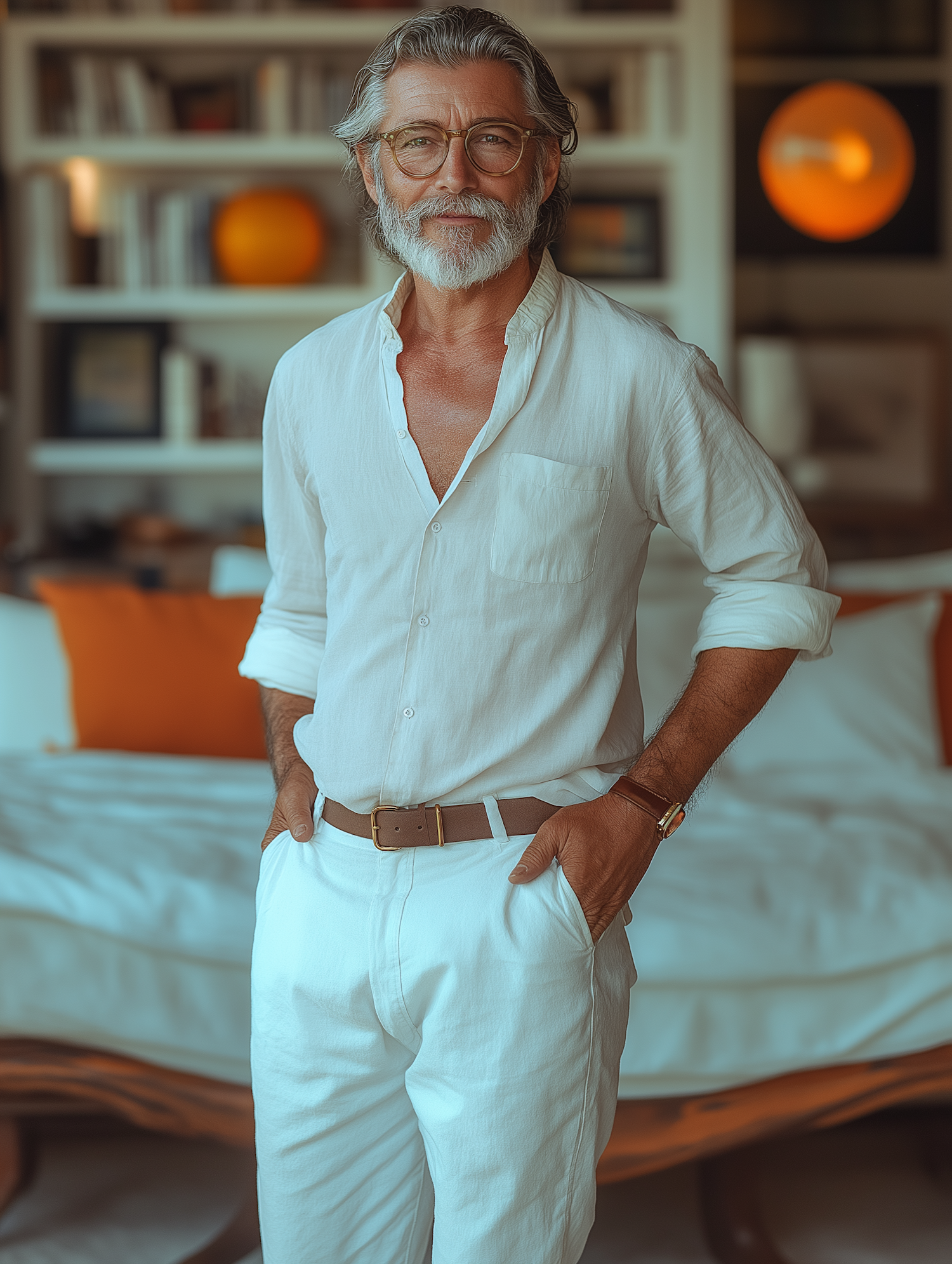 Mature man with gray hair and beard in white attire, standing in a cozy room with warm lighting and a blurred bookshelf background.