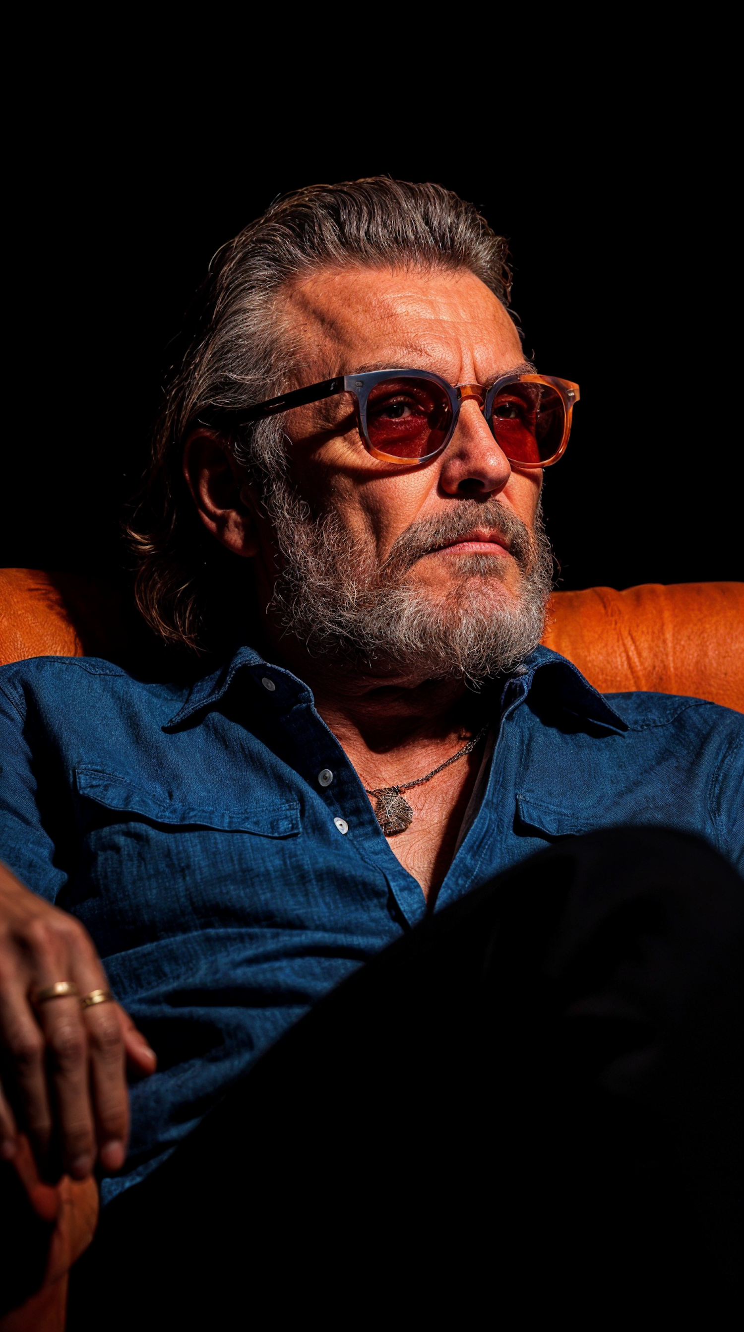 Middle-aged man with beard and sunglasses in blue shirt, sitting in an orange chair against a dark background.
