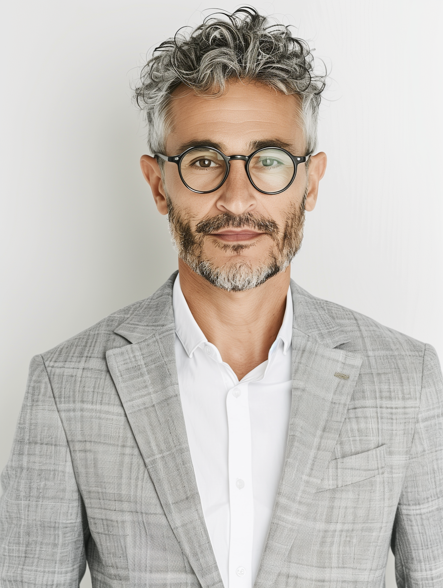 Stylish middle-aged man with curly hair and glasses in a gray plaid suit, exuding confidence and professionalism.