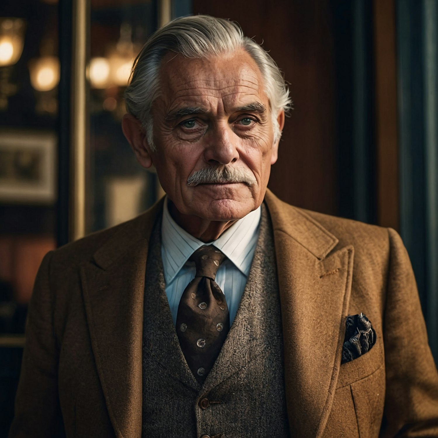 Distinguished elderly man with silver hair and mustache in a classic brown three-piece suit, exuding elegance and wisdom.