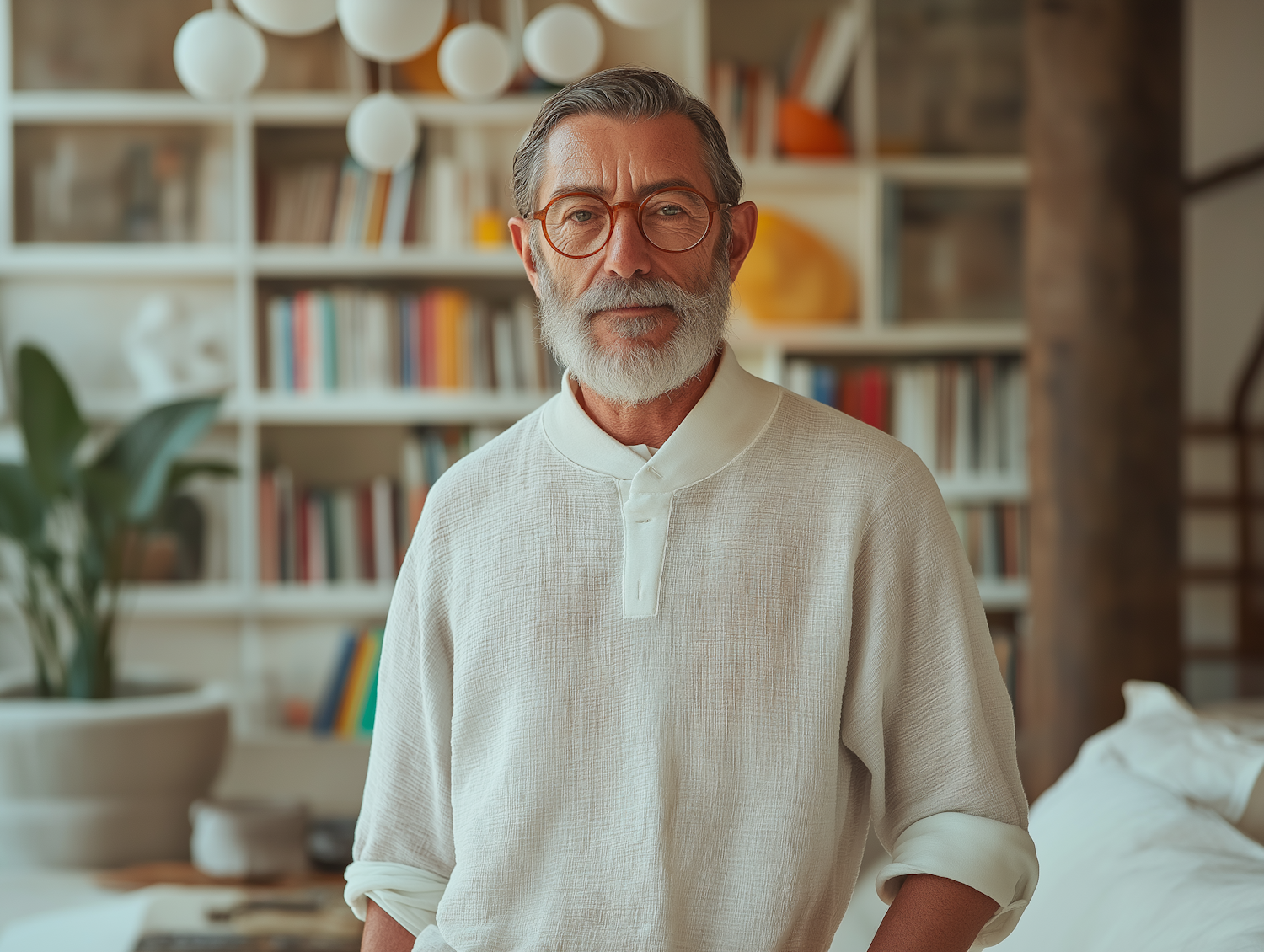 Elderly man with white beard and glasses in a cozy room with bookshelves and plants, exuding wisdom and calmness.