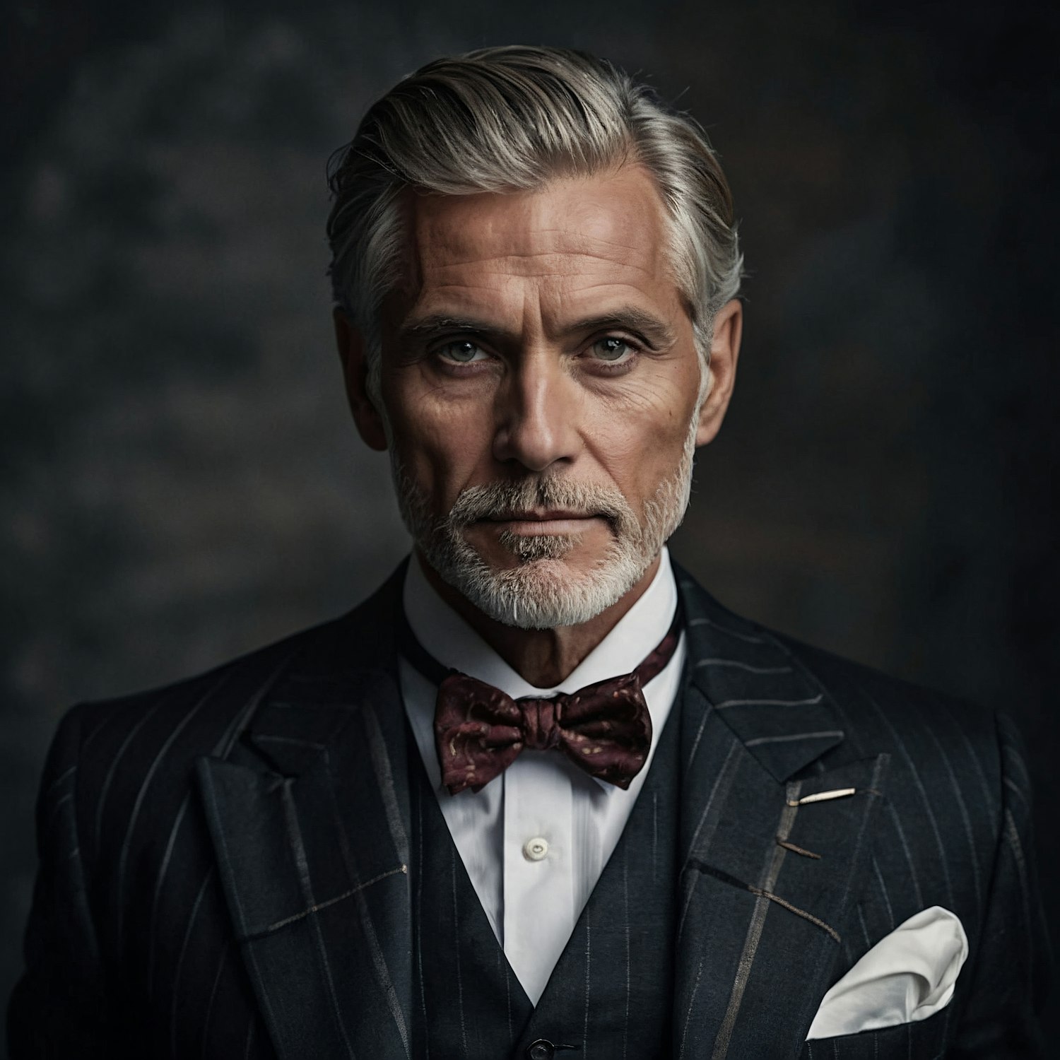 Distinguished man in a pinstripe suit with a white beard and silver hair, wearing a burgundy bow tie. Elegant and sophisticated look.