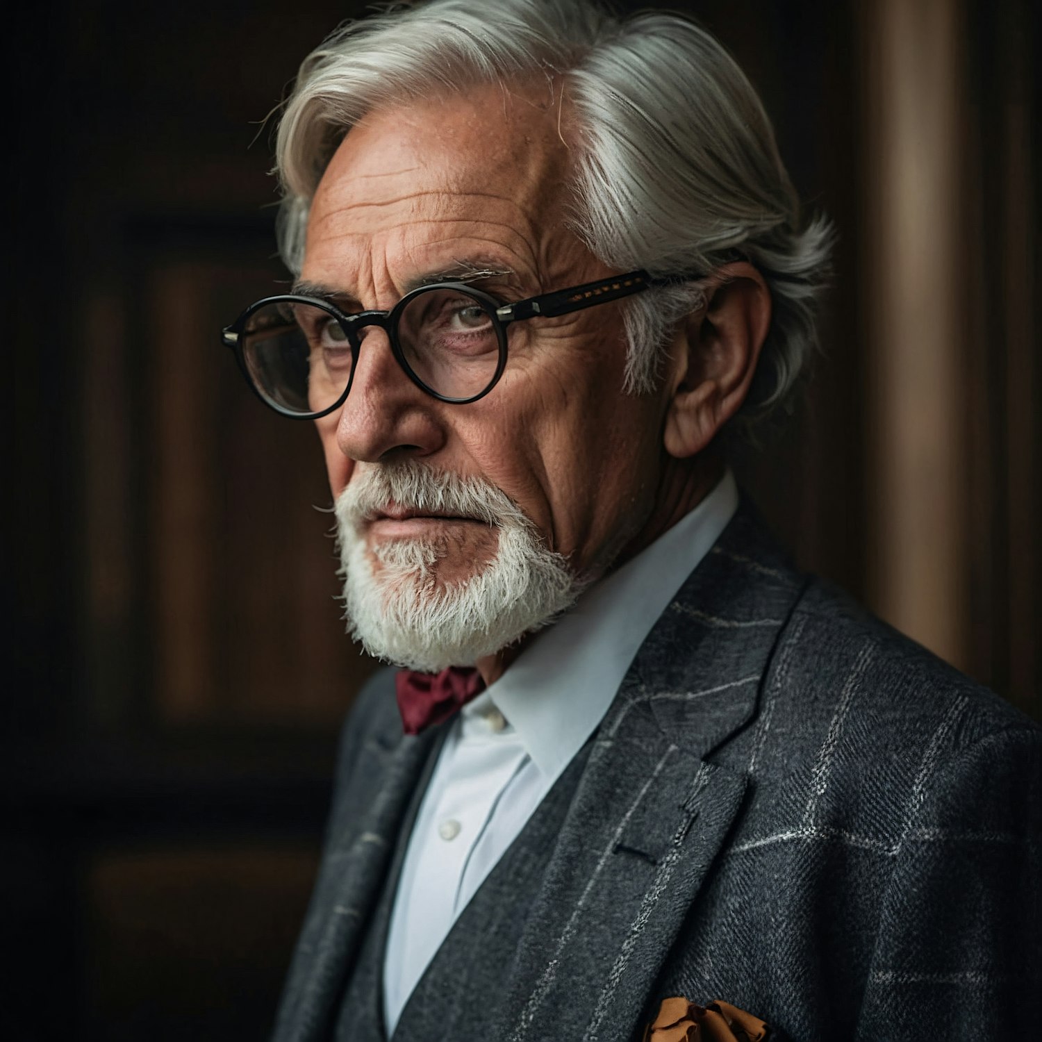 Elderly man with white hair and beard, wearing glasses and a gray suit with a red bow tie, exuding wisdom and sophistication.