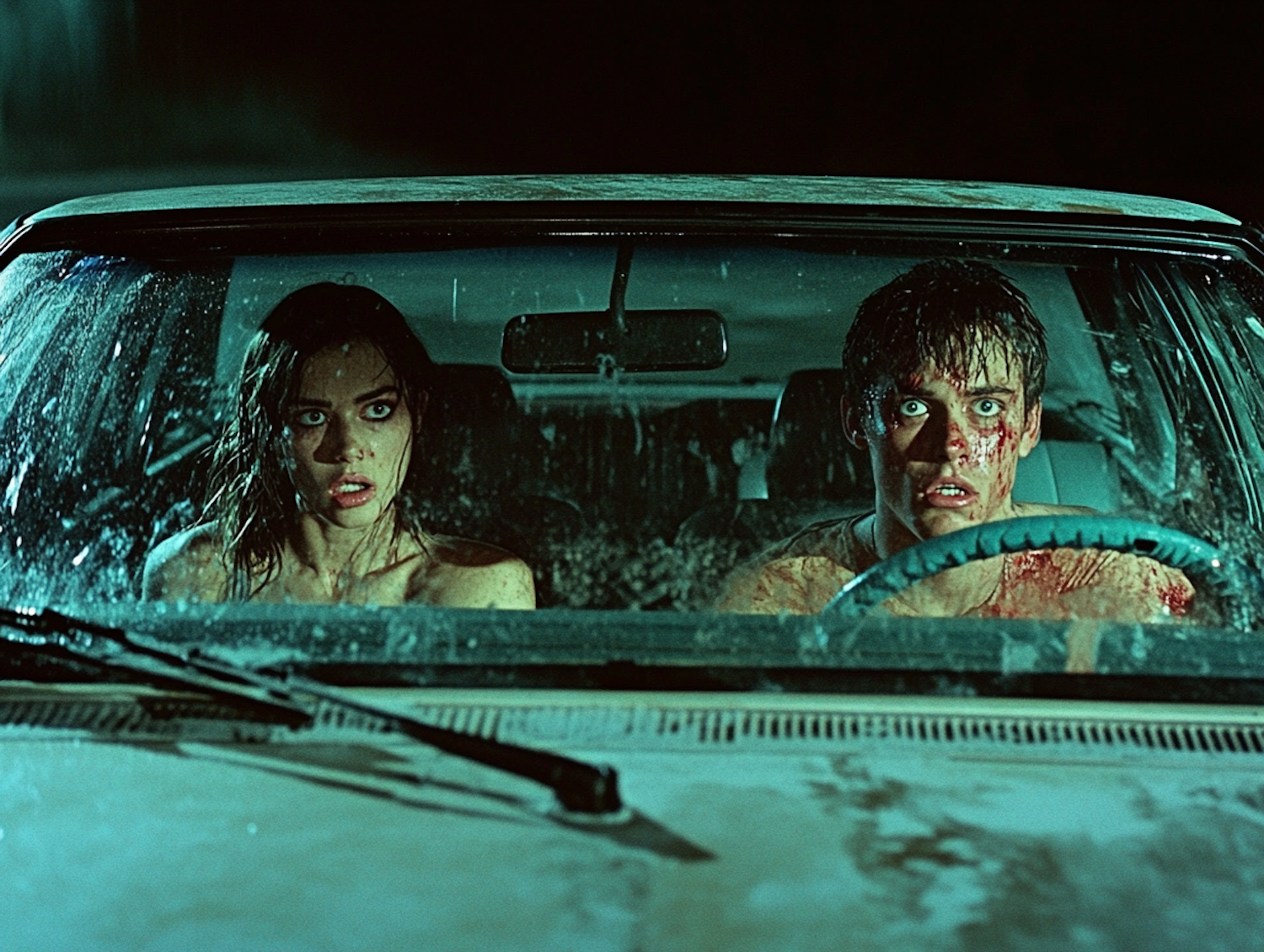 Two distressed individuals in a rain-soaked car, one covered in blood, both displaying shock and fear. Intense and dramatic scene.