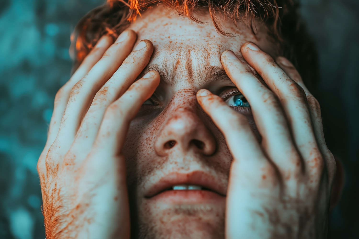 Close-up of a freckled man with blue eyes, hands covering his face, and dirt-streaked fingers, evoking a raw and emotional moment.