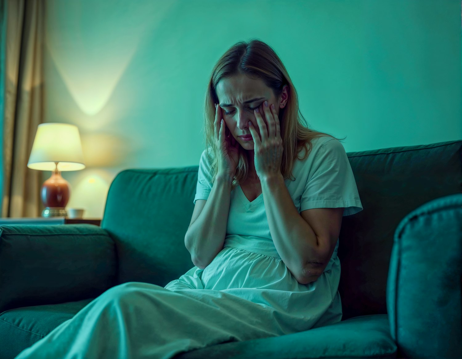A woman in distress sits on a sofa, holding her head in a dimly lit room with a warm lamp glow.