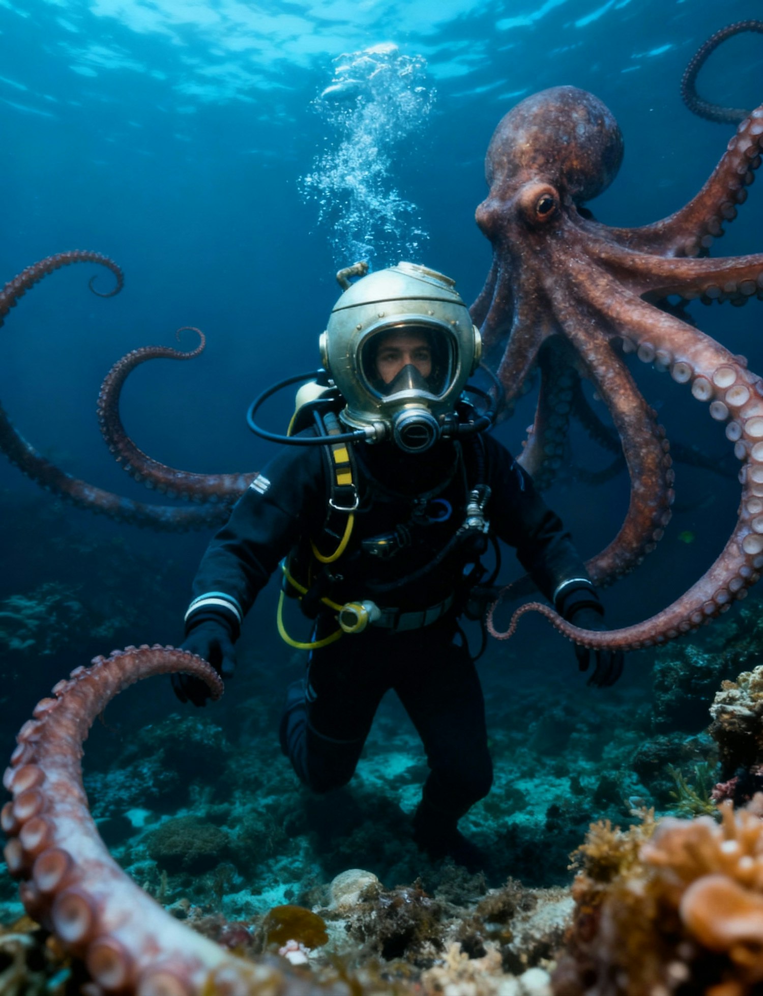A diver in a vintage suit interacts with a large octopus underwater, surrounded by vibrant coral and marine life.