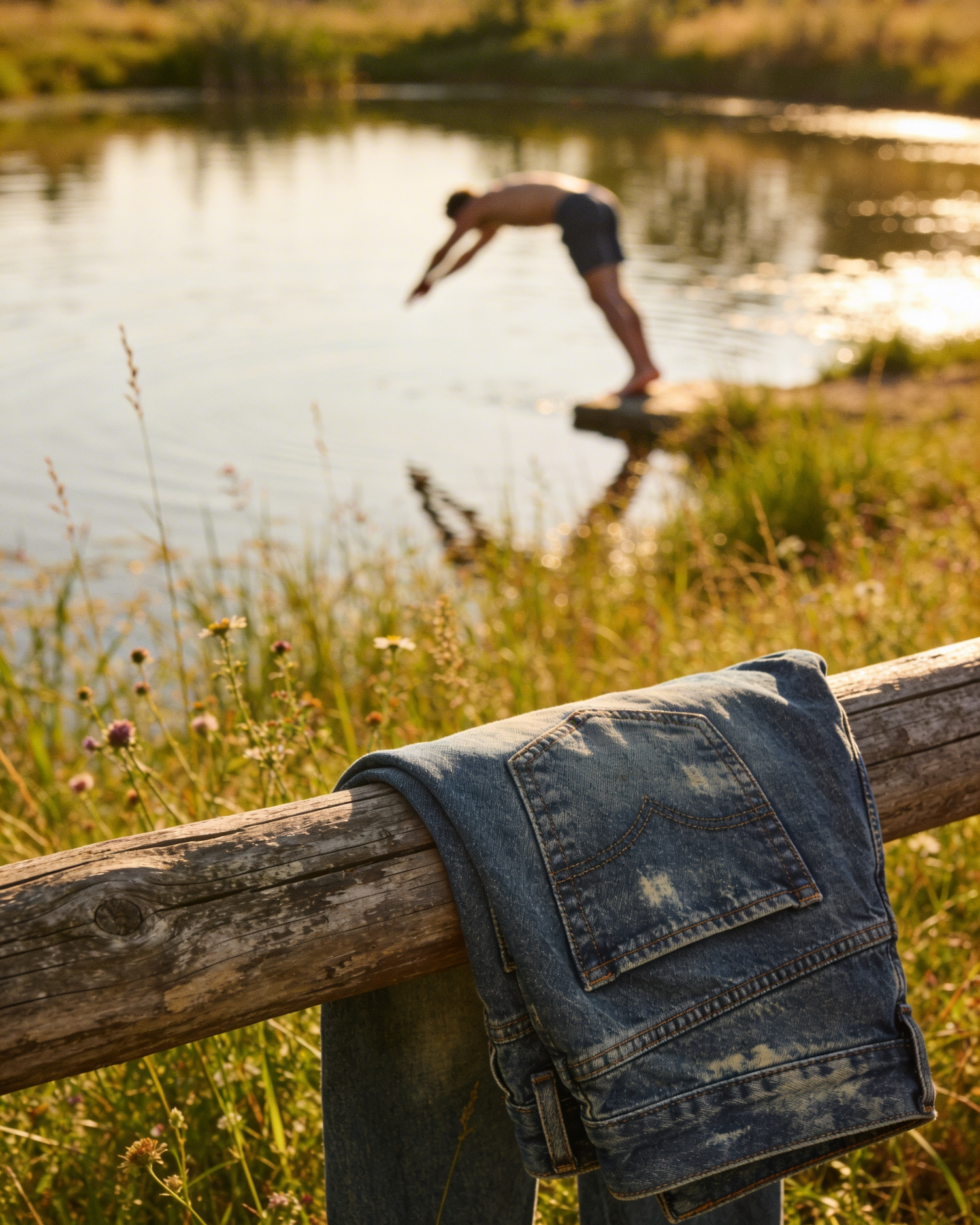 A person dives into a tranquil lake under golden sunlight, with jeans draped on a wooden fence in a lush, grassy setting.
