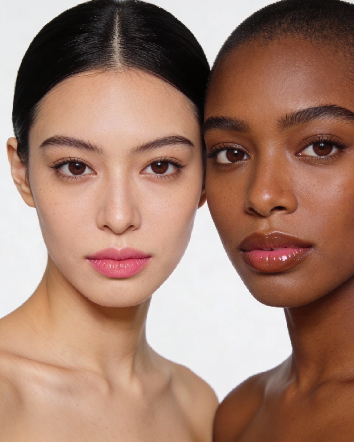 Two female models in a clean high-end beauty editorial studio photo. Model A: light skin with neutral undertone, straight black hair slicked back with a middle part, almond-shaped dark brown eyes, thin slightly arched eyebrows, narrow nose, soft pink lips on the thinner side. Model B: deep dark skin with warm undertone, very short buzz cut hair, slightly rounder dark brown eyes, fuller thicker eyebrows, wider nose, full brown-pink glossy lips. The two models are side by side, faces close but not touching yet, both full faces visible from forehead to chin, neutral calm expression, minimal makeup, realistic skin texture with pores, soft glow, white seamless background, soft diffused studio lighting, ultra realistic photography, shallow depth of field, sharp focus on eyes and skin.