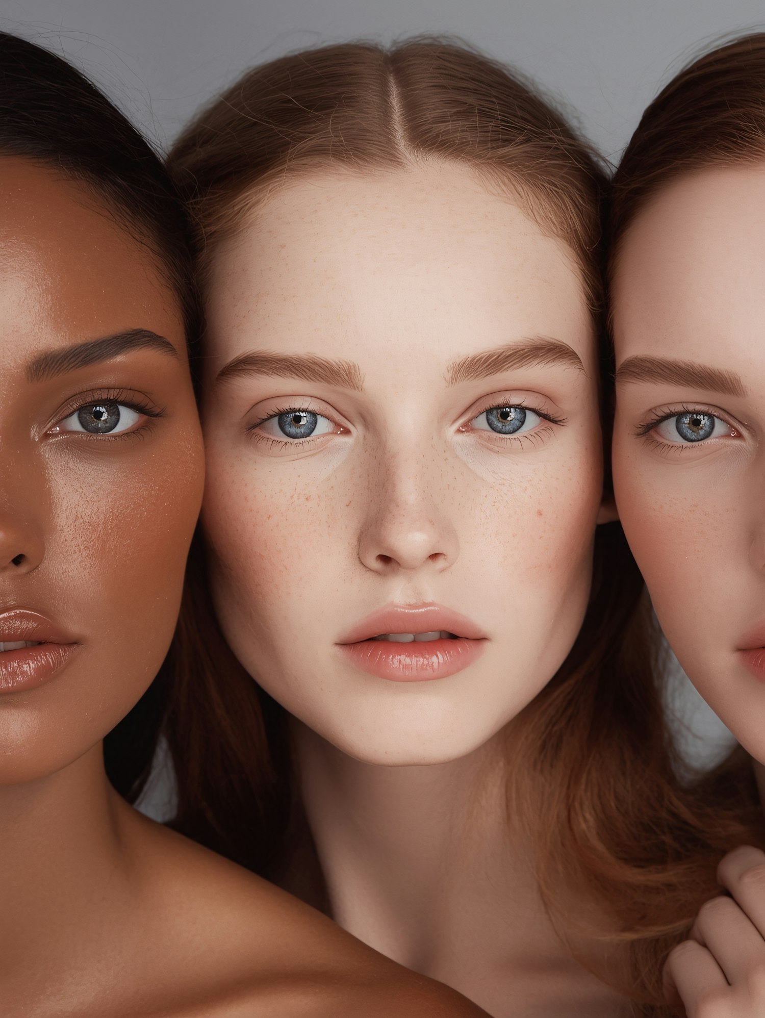 A close-up of three women with diverse skin tones and blue eyes, highlighting natural beauty and diversity in a neutral setting.