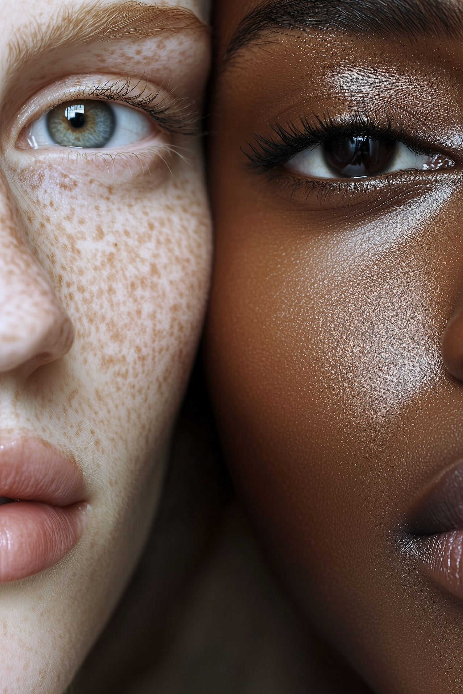 Close-up of two faces with contrasting skin tones, showcasing freckles, smooth skin, and striking eye details. A celebration of diversity.