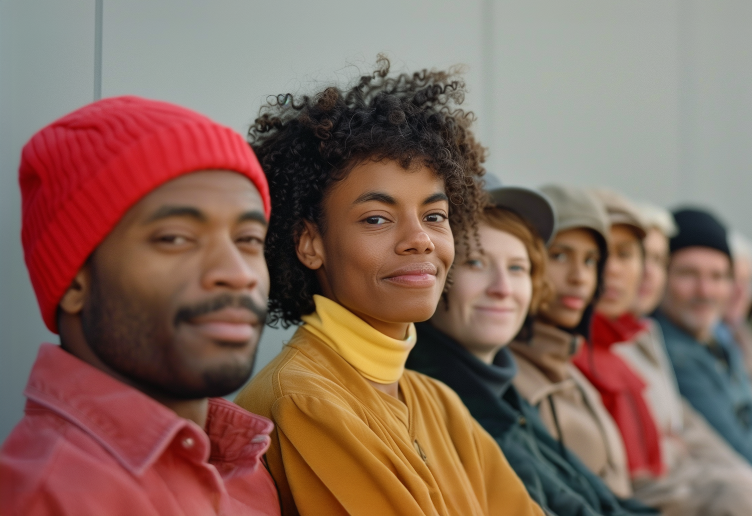 A diverse group of people seated in a row, smiling and looking at the camera, dressed in winter clothing.