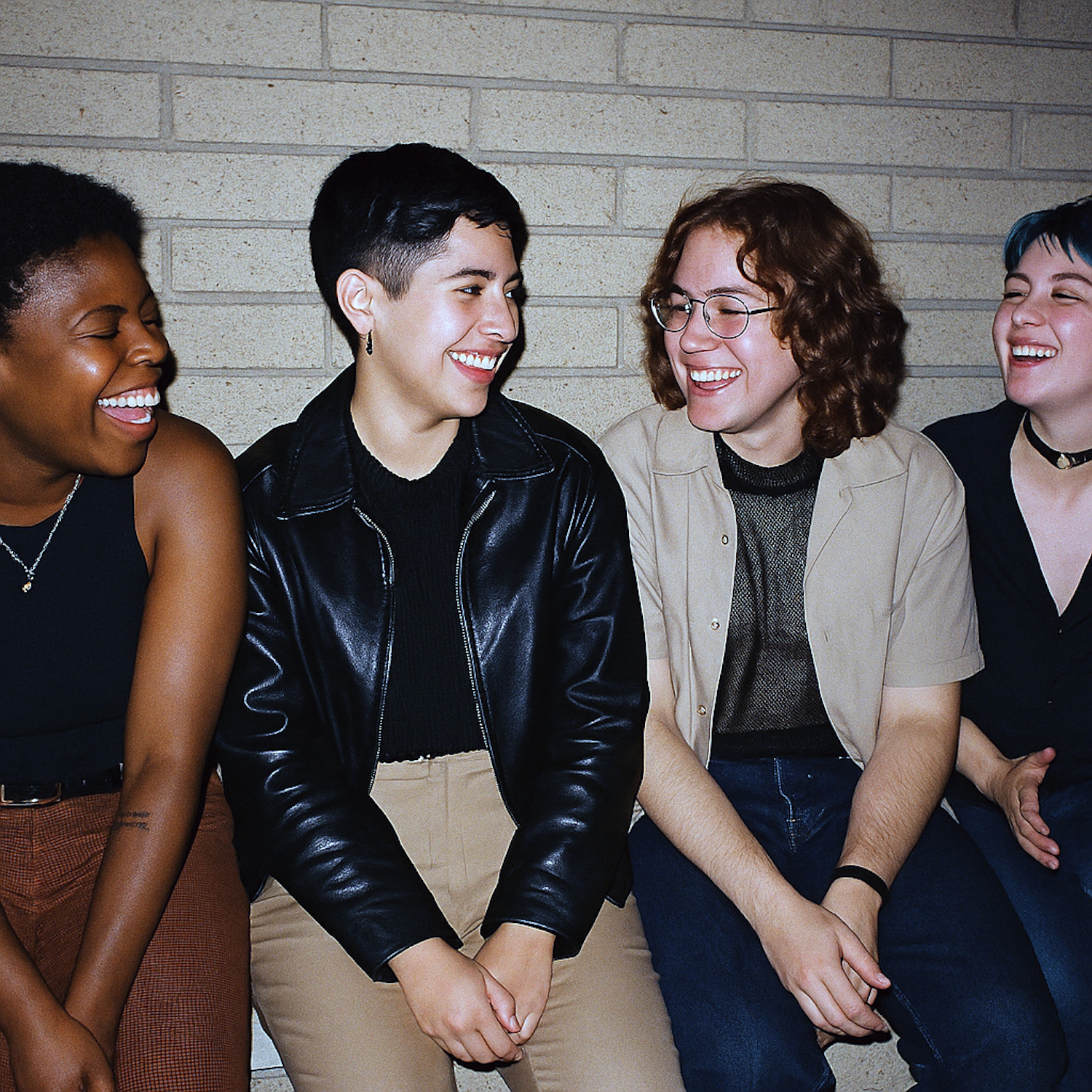 A group of four friends laughing together, showcasing diverse styles and joyful expressions against a brick wall.