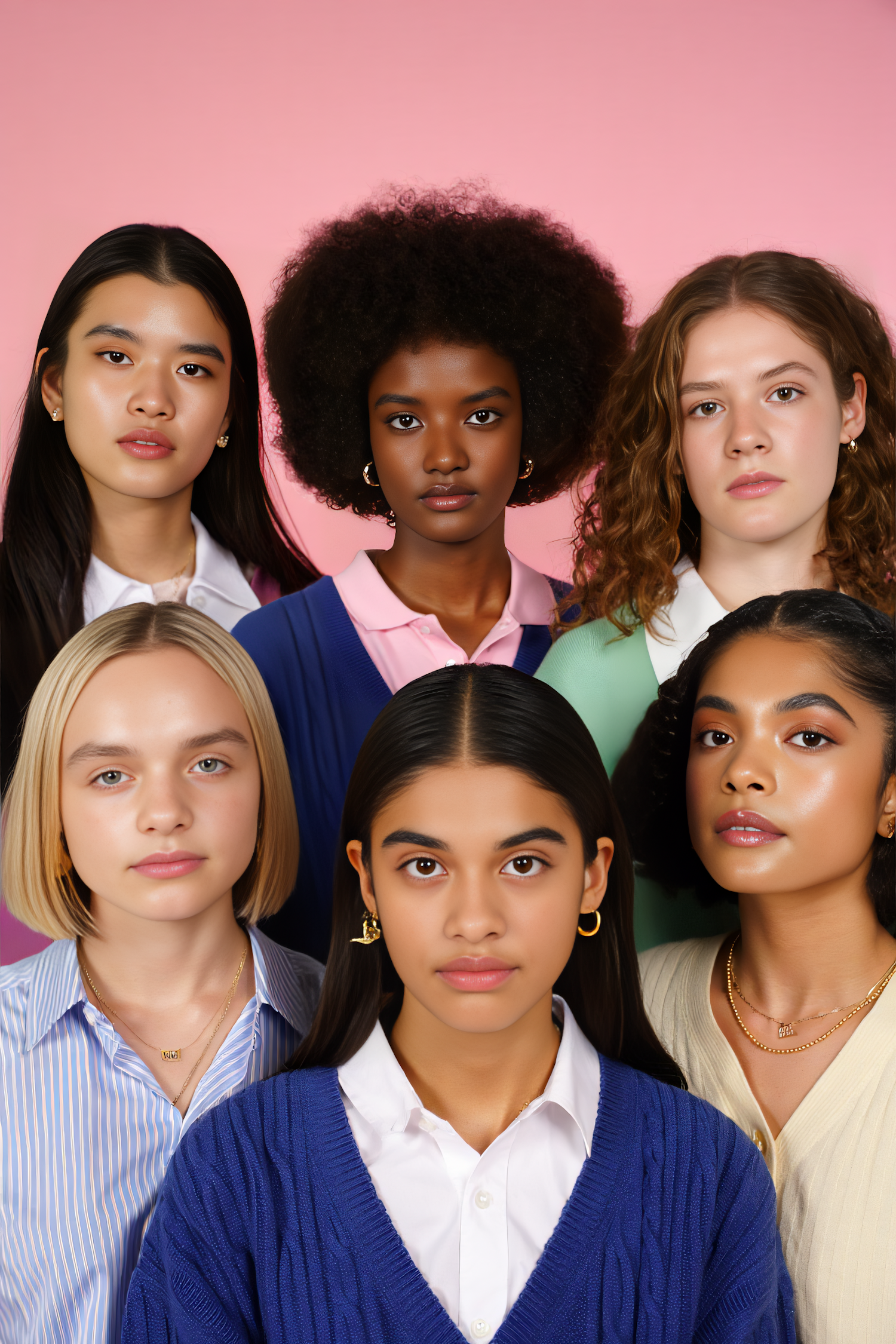 A diverse group of six young women standing together against a pink background, showcasing unique styles and expressions.
