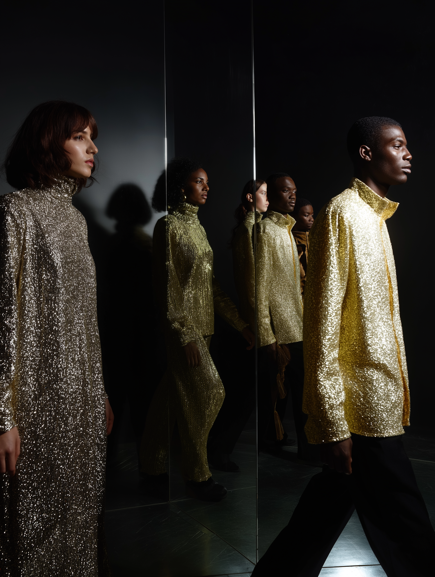 Diverse models in shimmering gold outfits walk in a reflective, dimly lit space, creating a bold and luxurious fashion statement.