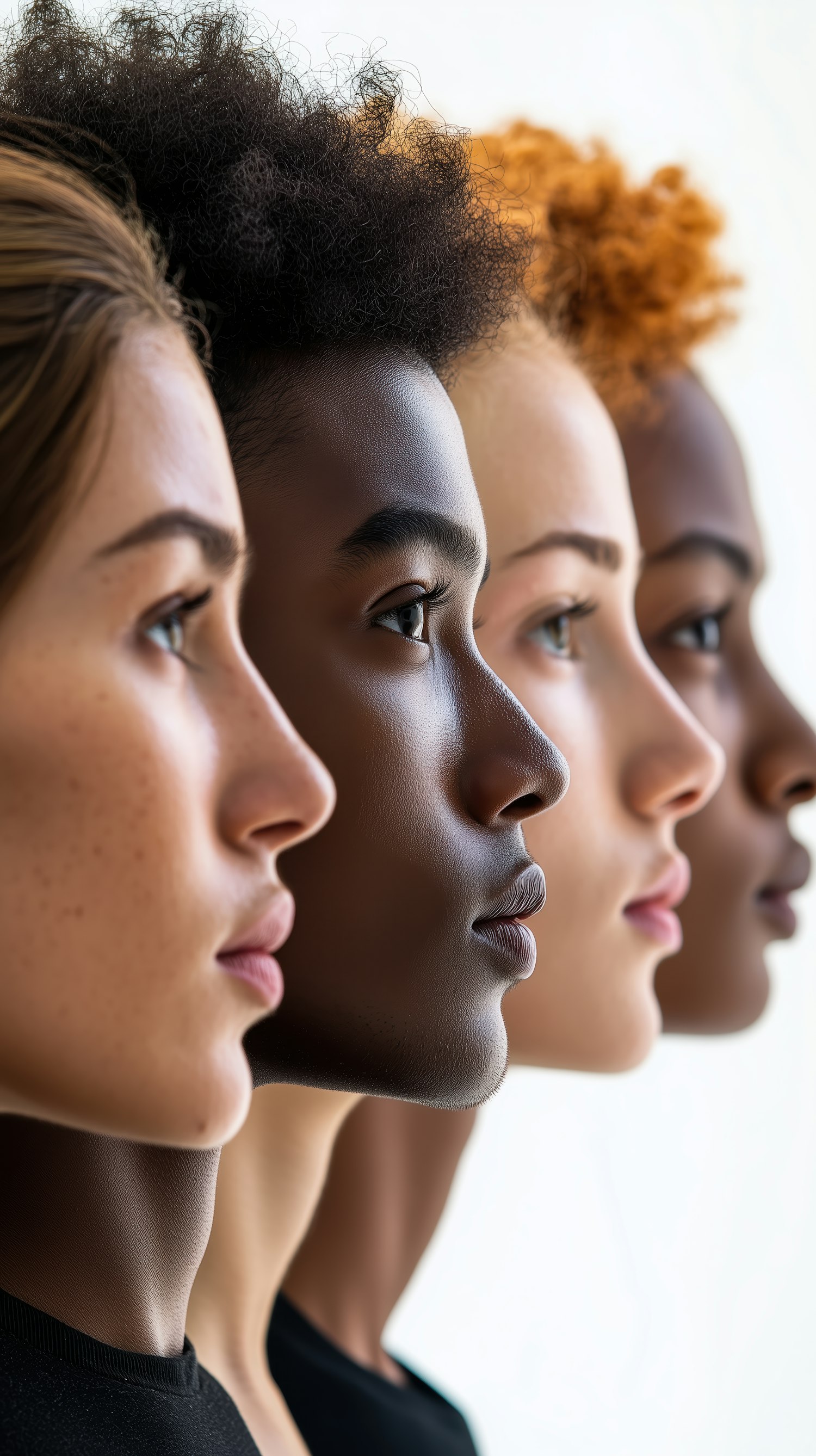 Four diverse individuals in profile, showcasing unity and diversity with distinct features and expressions.