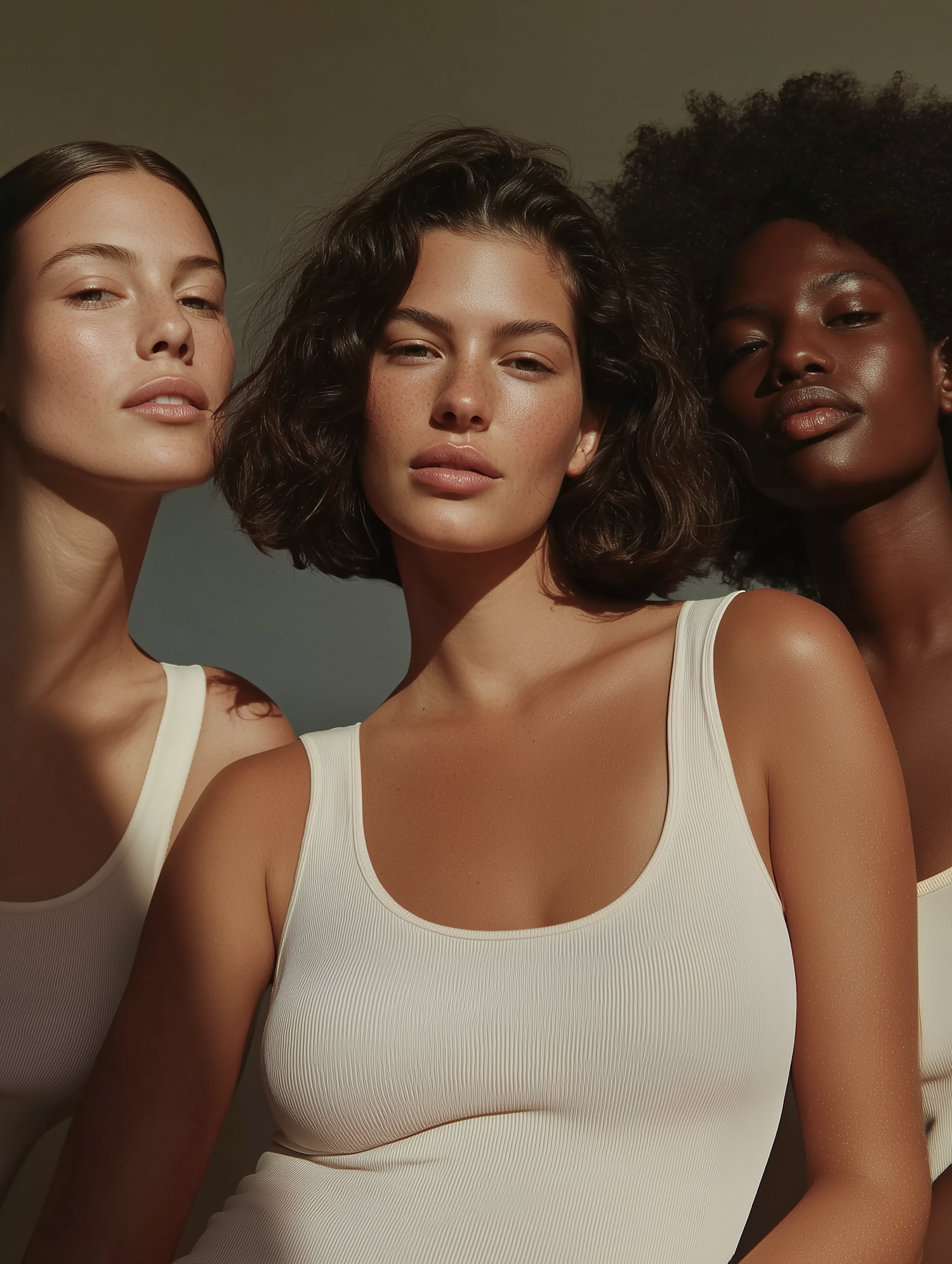 Three women of diverse backgrounds pose together in soft lighting, showcasing natural beauty and unity in neutral-toned outfits.