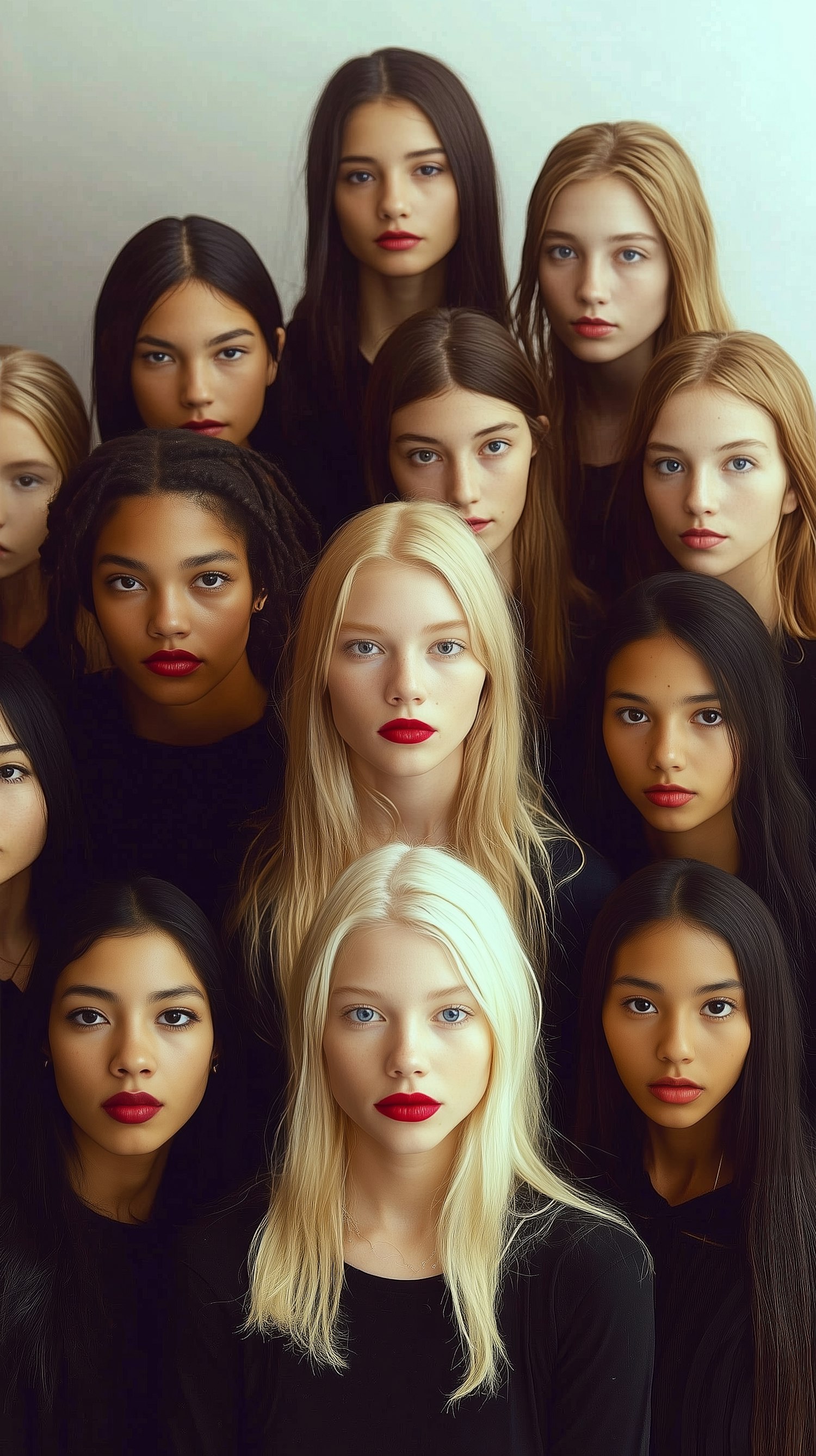 A group of diverse women in black attire with red lipstick, arranged closely together, looking directly at the camera.