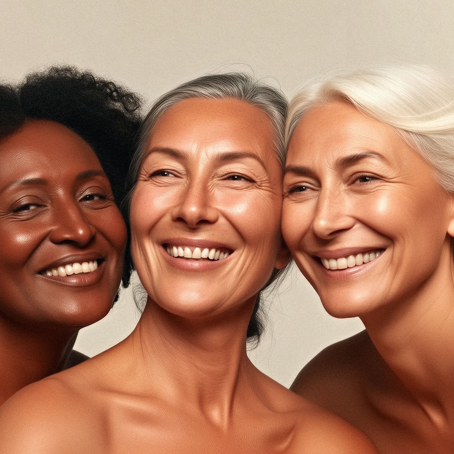 Three women of diverse backgrounds smiling warmly, showcasing natural beauty and joy in a close-up portrait with a neutral background.